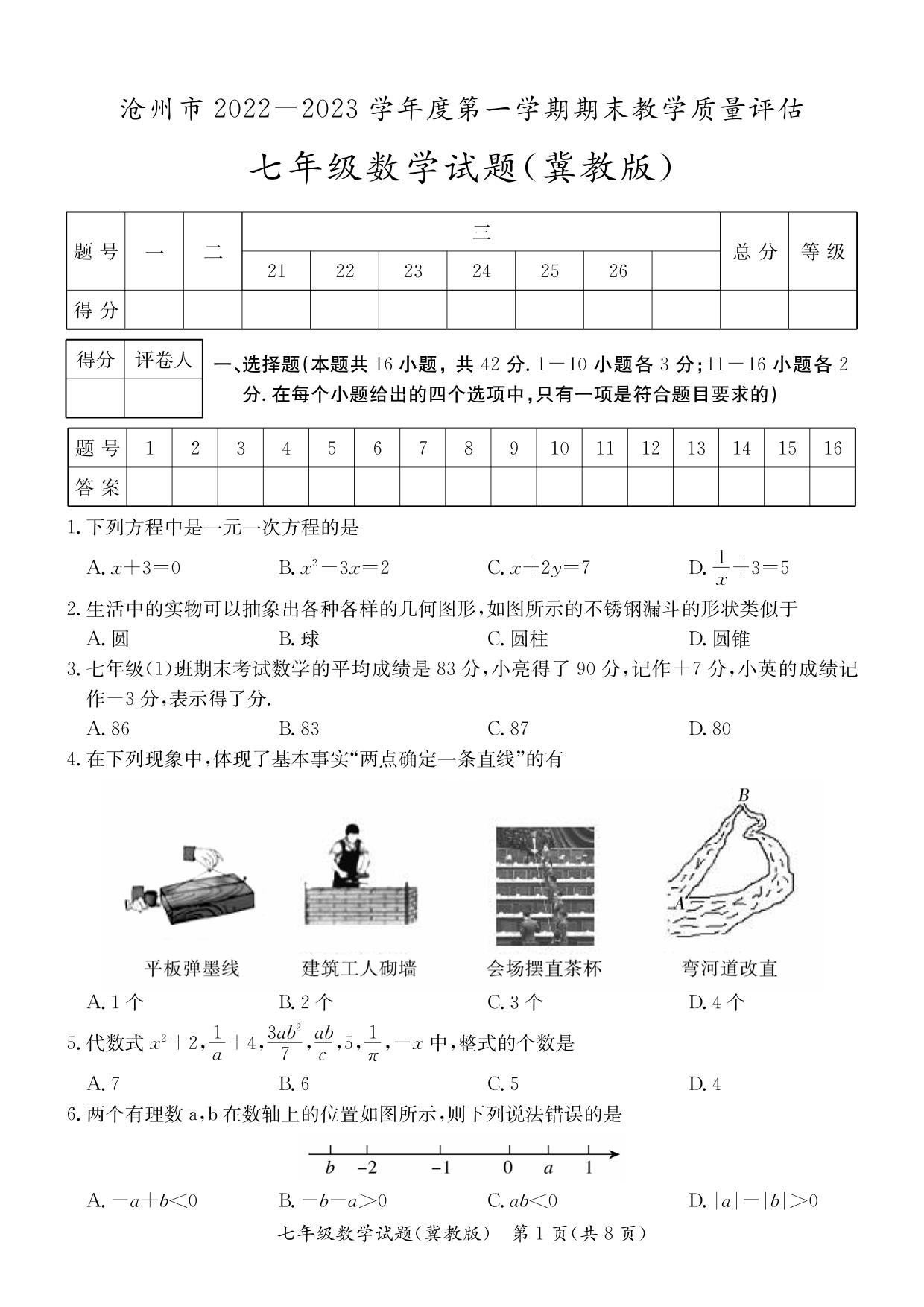 河北省沧州市2022-2023学年度第一学期期末教学质量评估试题七年级数学(冀教版)