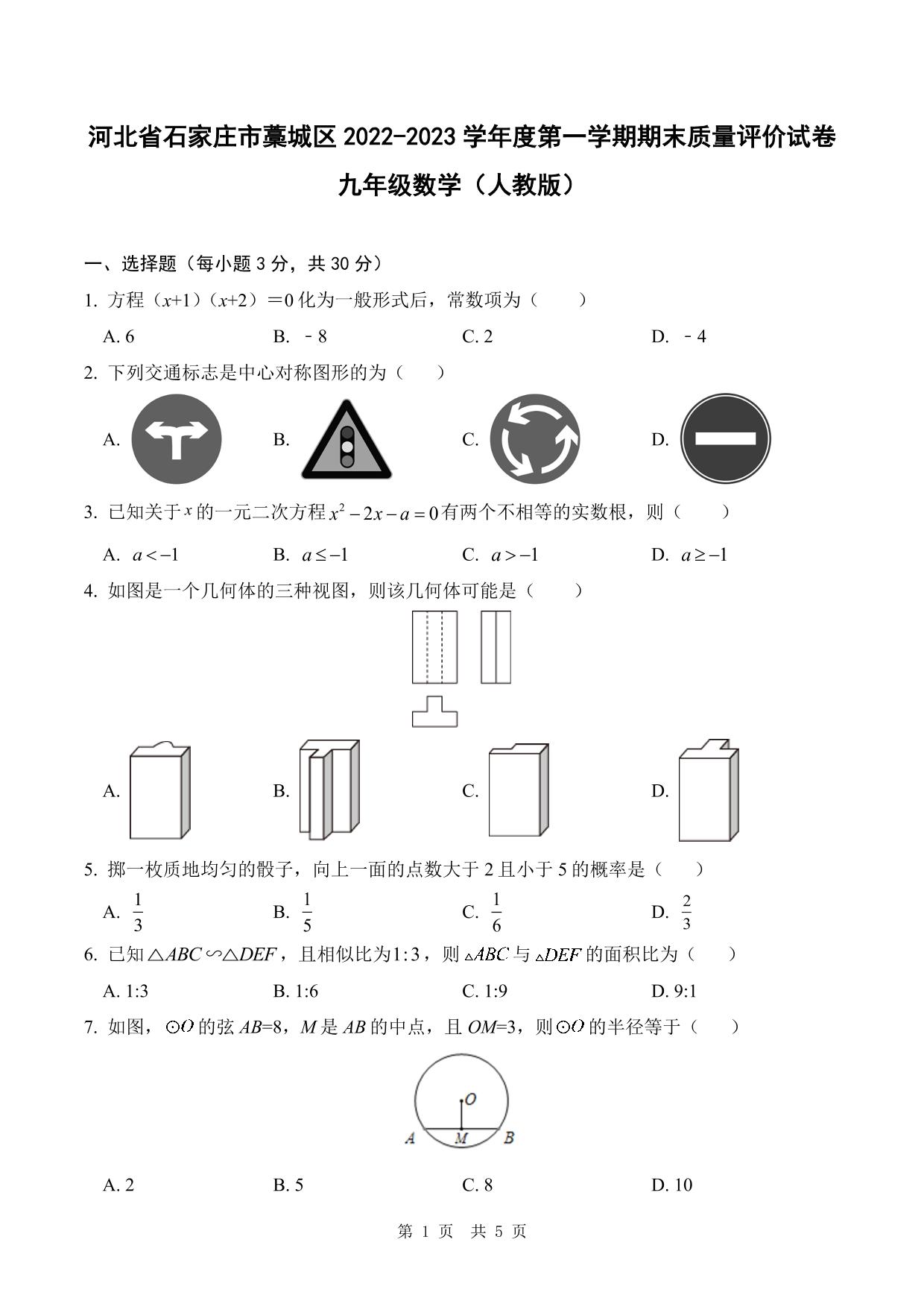 河北省石家庄市藁城区2022-2023学年度第一学期期末质量评价试卷九年级数学(人教版)