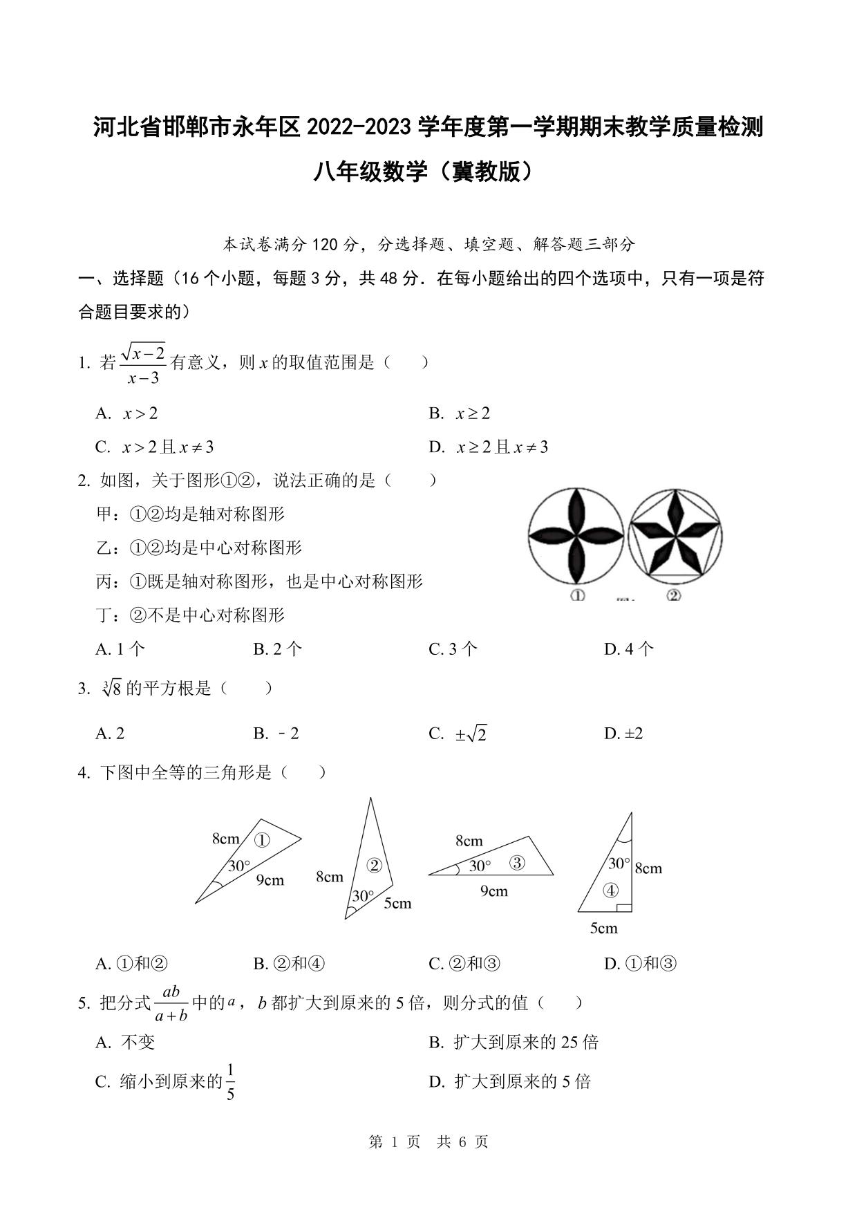 河北省邯郸市永年区2022-2023学年度第一学期期末教学质量检测试卷八年级数学(冀教版)