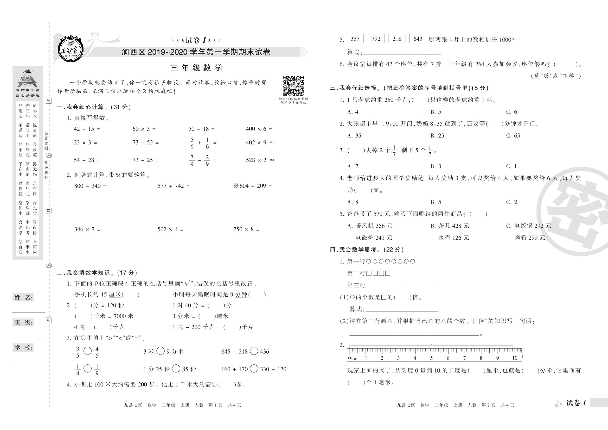 2019-2020学年第一学期洛阳市涧西区三年级数学试卷(人教版)【1】