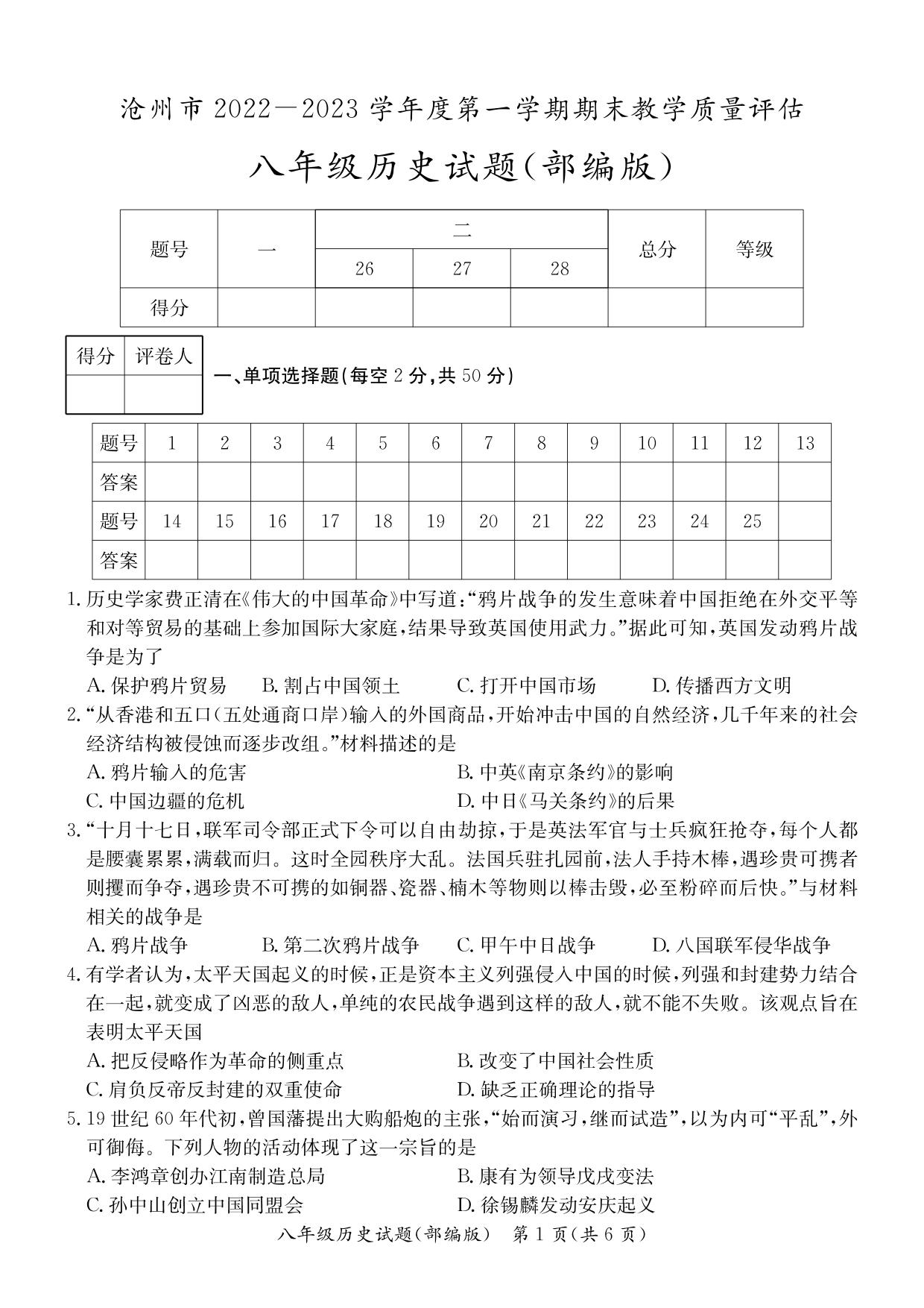 河北省沧州市2022-2023学年度第一学期期末教学质量评估试题八年级历史(人教版)