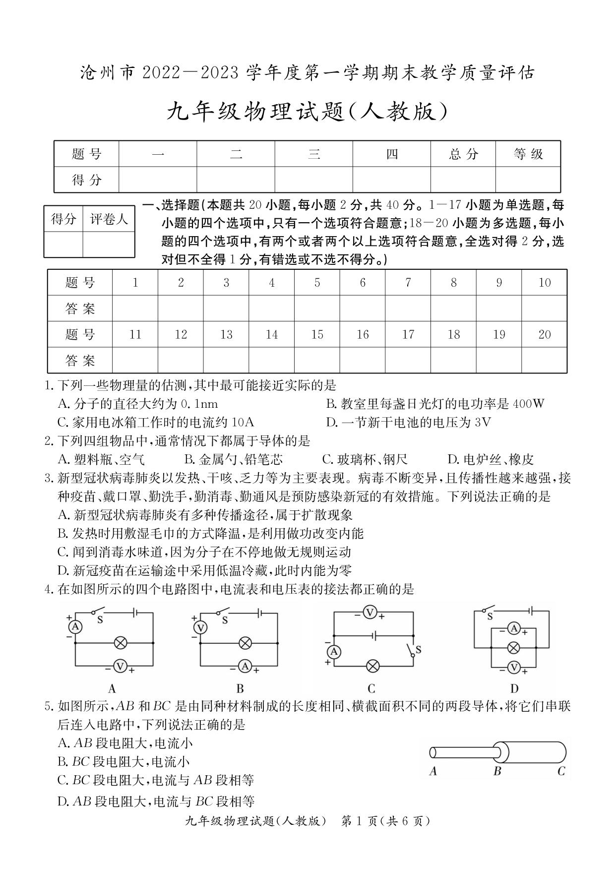河北省沧州市2022-2023学年度第一学期期末教学质量评估试题九年级物理(人教版)