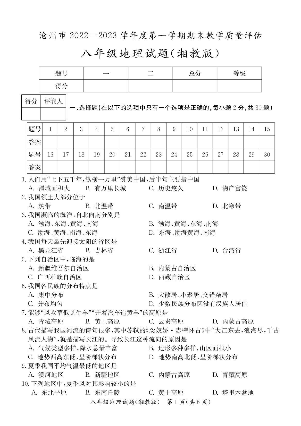 河北省沧州市2022-2023学年度第一学期期末教学质量评估试题八年级地理(湘教版)