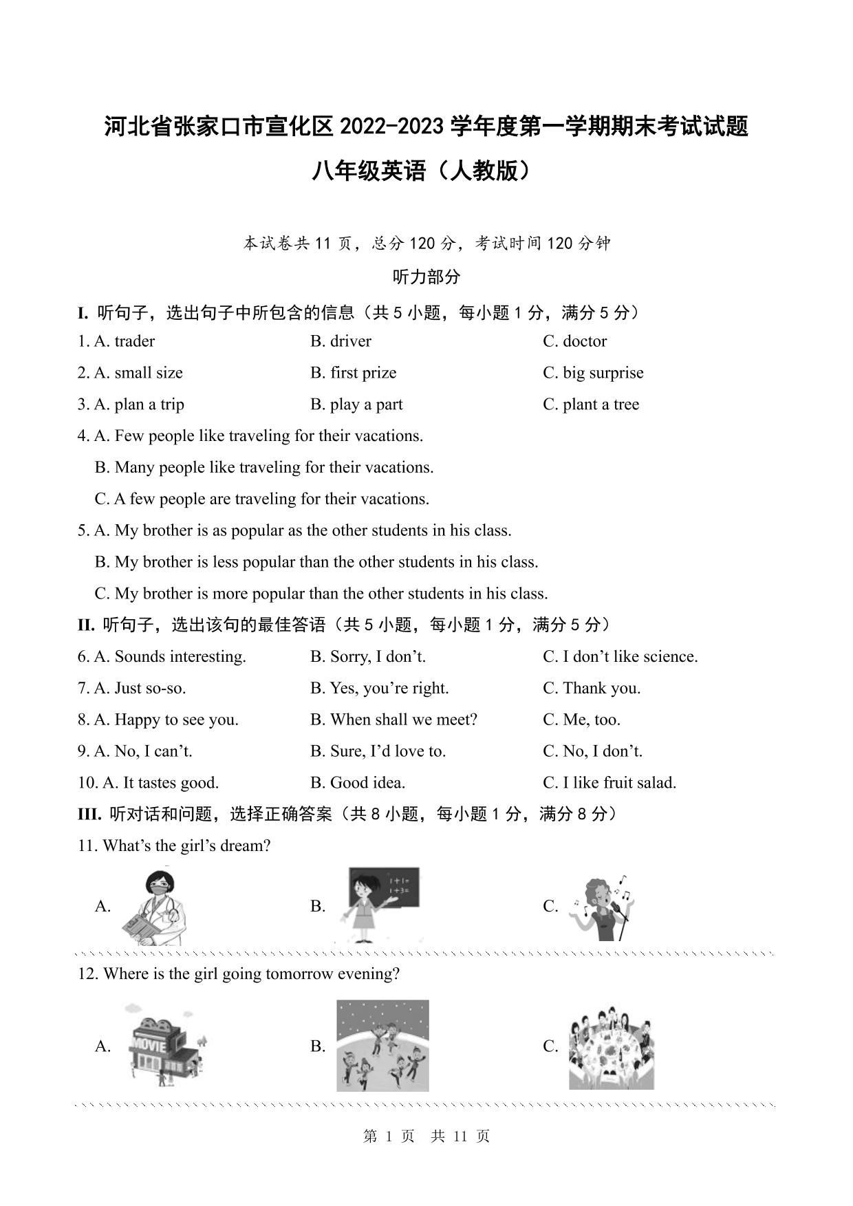 河北省张家口市宣化区2022-2023学年度第一学期期末考试试题八年级英语(人教版)
