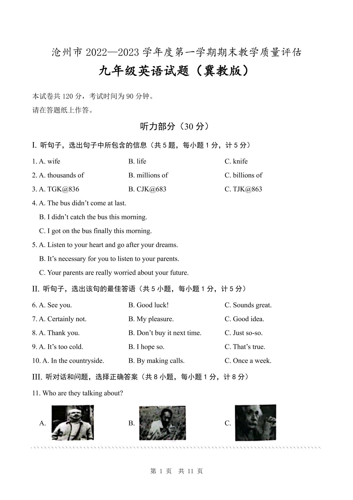 河北省沧州市2022-2023学年度第一学期期末教学质量评估试题九年级英语(冀教版)