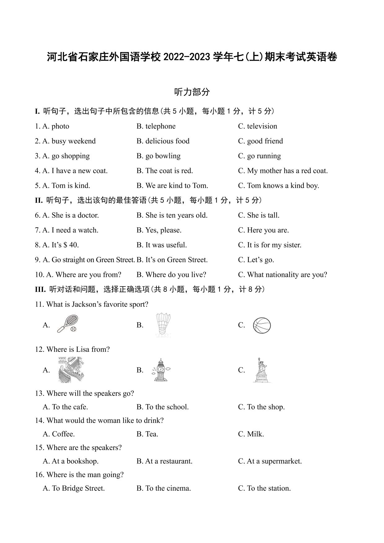 河北省石家庄外国语学校2022-2023学年(上)期末考试卷七年级英语(人教版)【无听力音频】