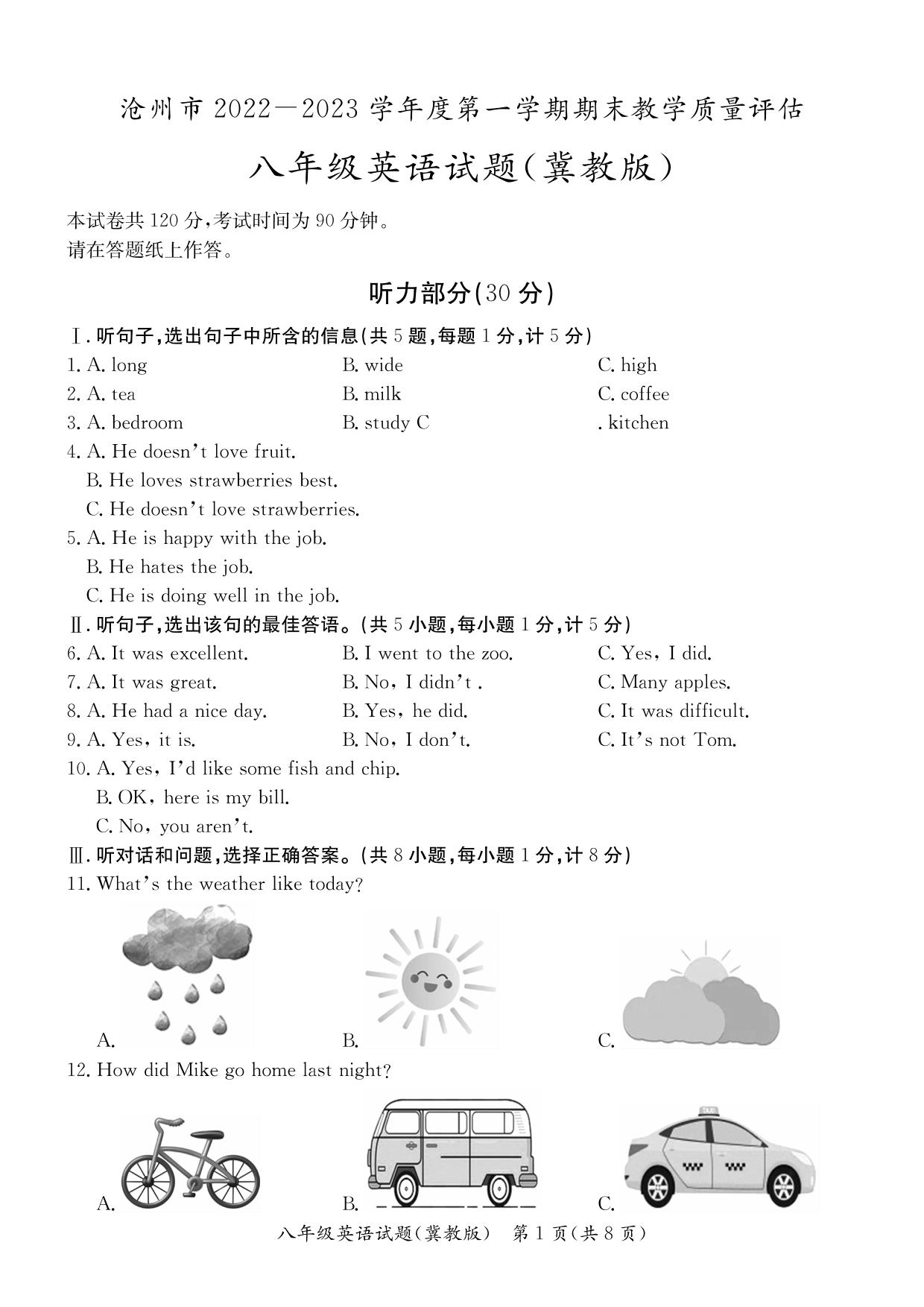 河北省沧州市2022-2023学年度第一学期期末教学质量评估试题八年级英语(冀教版)