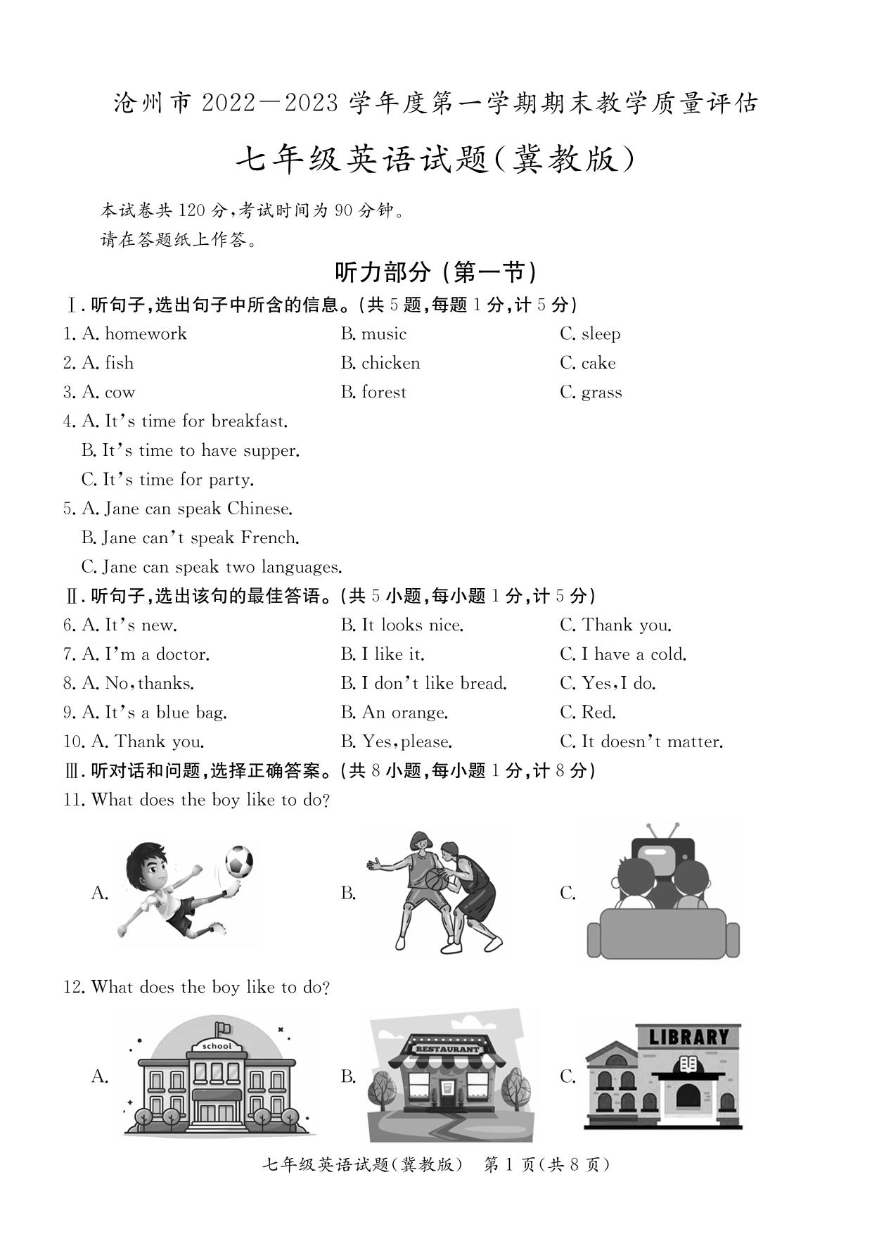 河北省沧州市2022-2023学年度第一学期期末教学质量评估试题七年级英语(冀教版)