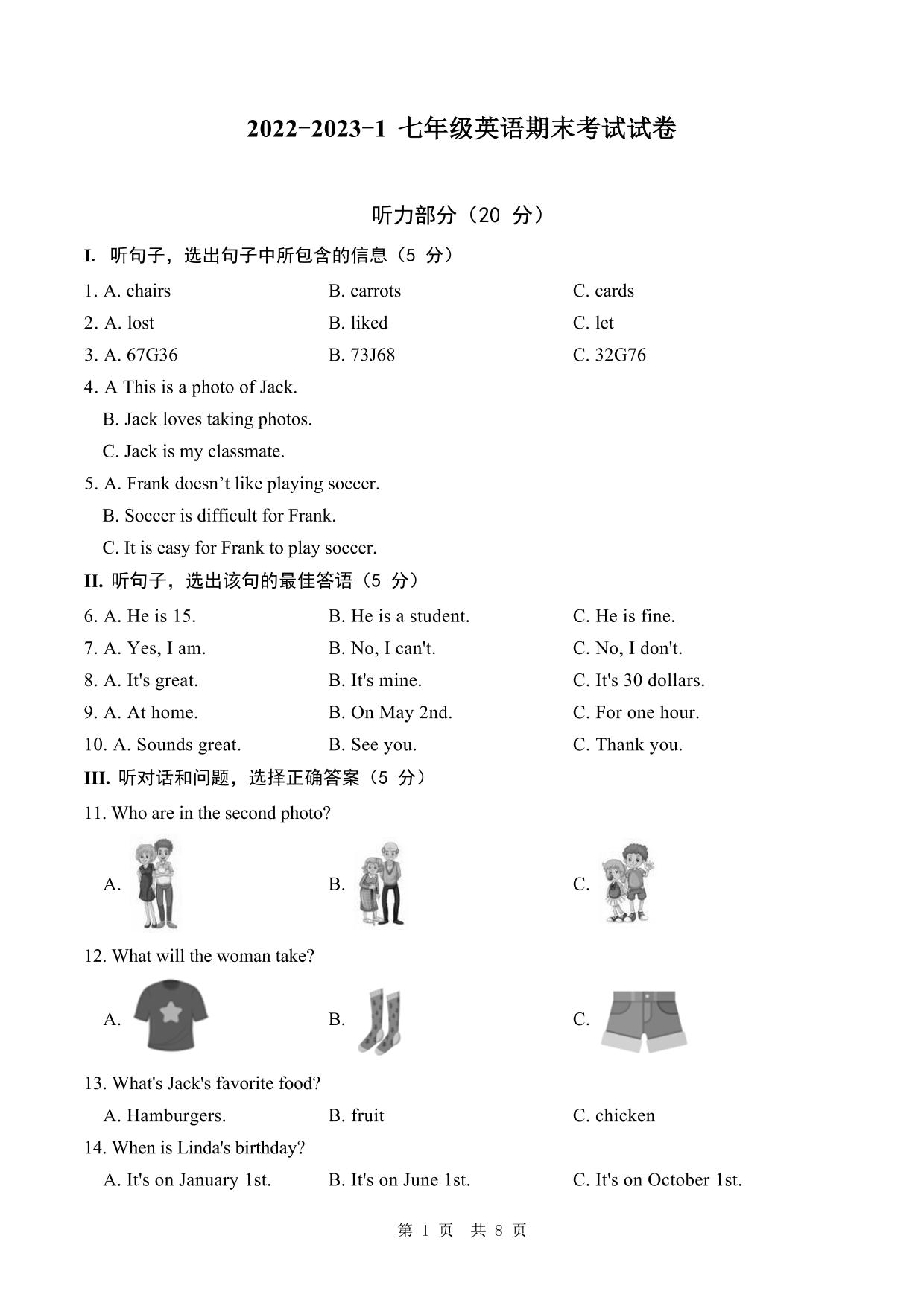 河北省秦皇岛市第七中学集团联考2022-2023学年上学期期末试卷七年级英语(人教版)