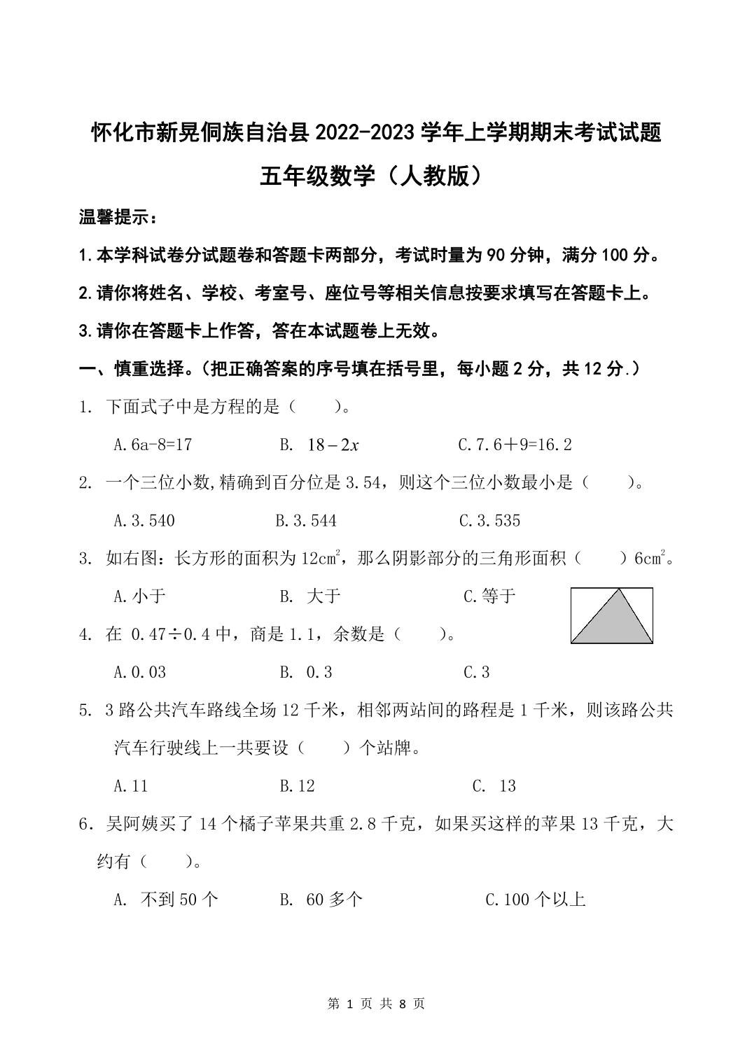 湖南省怀化市新晃侗族自治县2022—2023学年上学期期末考试试题五年级数学(人教版)