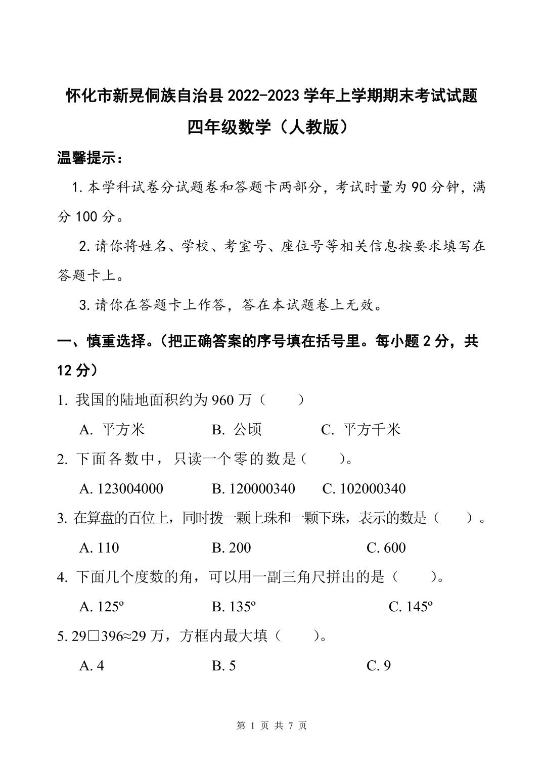 湖南省怀化市新晃侗族自治县2022—2023学年上学期期末考试试题四年级数学(人教版)