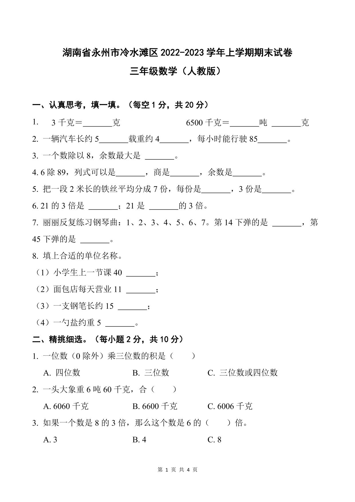 湖南省永州市冷水滩区2022—2023学年上学期期末试卷三年级数学(人教版)