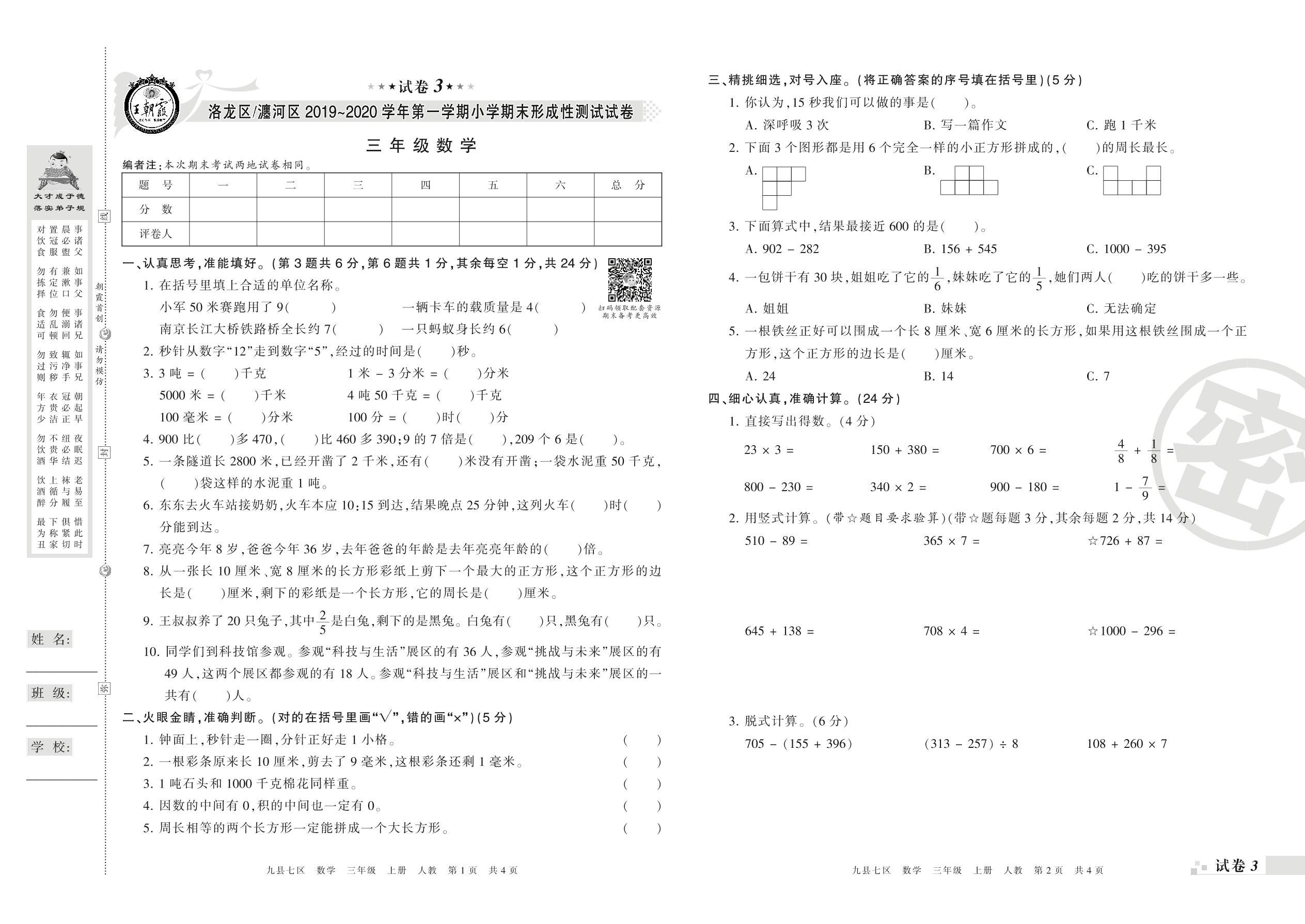 2019-2020学年第一学期洛阳市洛龙区、瀍河区三年级数学试卷(人教版)【3】