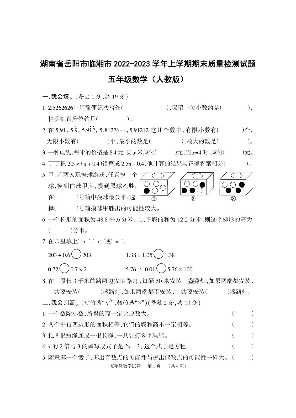 湖南省岳阳市临湘市2022—2023学年上学期期末质量检测试题五年级数学(人教版)