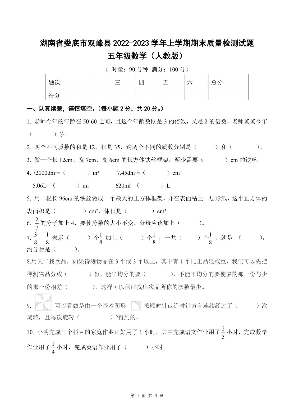 湖南省娄底市双峰县2022—2023学年上学期期末质量检测试题五年级数学(人教版)