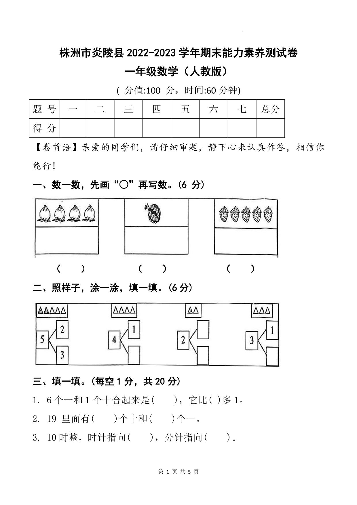 湖南省株洲市炎陵县2022—2023学年期末能力素养测试卷一年级数学(人教版)