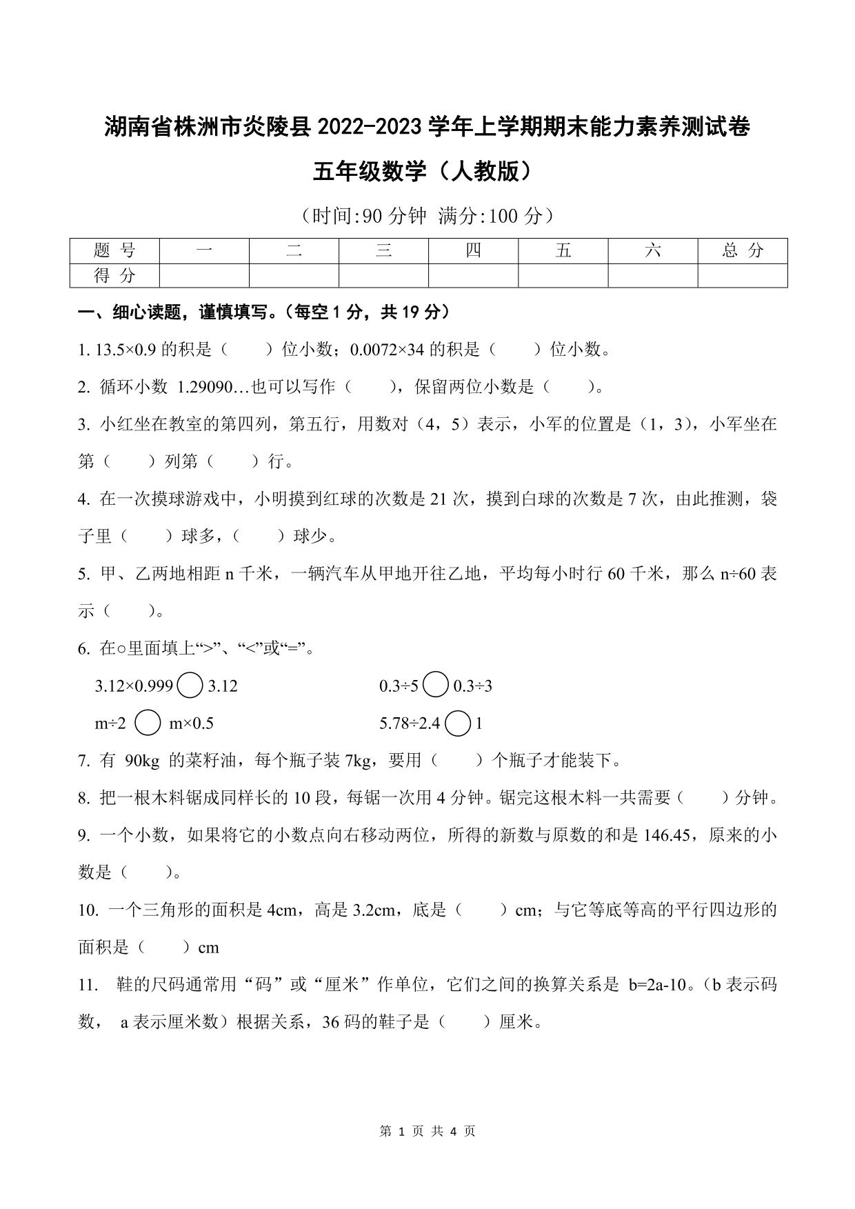 湖南省株洲市炎陵县2022—2023学年上学期期末能力素养测试卷五年级数学(人教版)