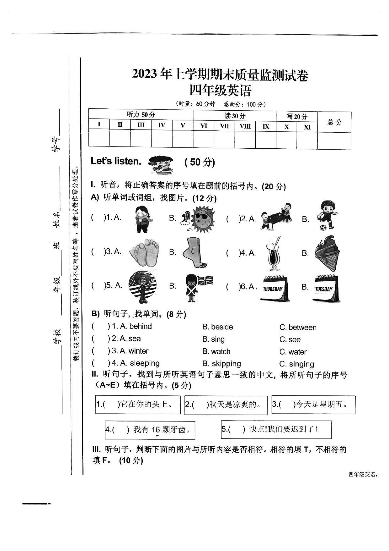 湖南省湘潭市雨湖区2022-2023学年上学期期末试题四年级英语(湘少版)【无听力音频】