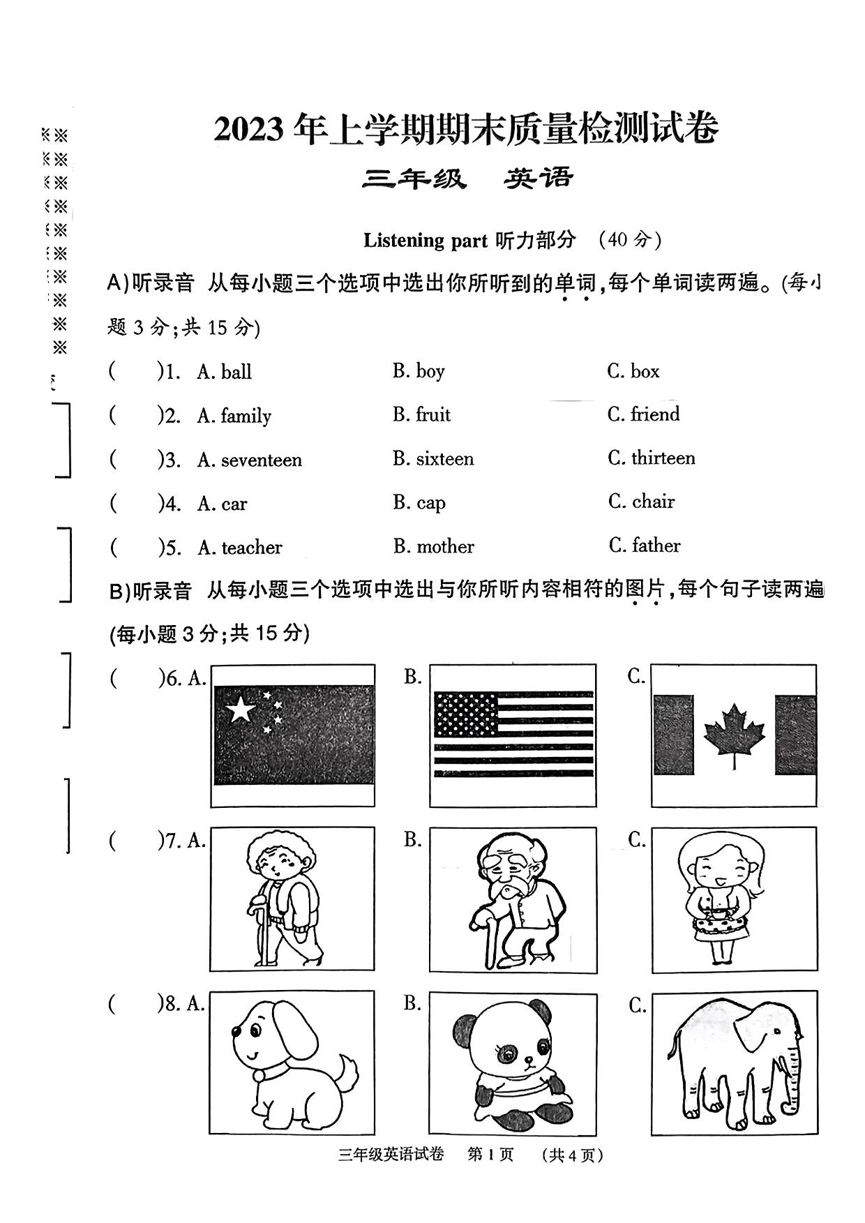 湖南省岳阳市九华山小学2022-2023学年上学期期末质量检测试卷三年级英语(人教PEP版)【无听力音频】