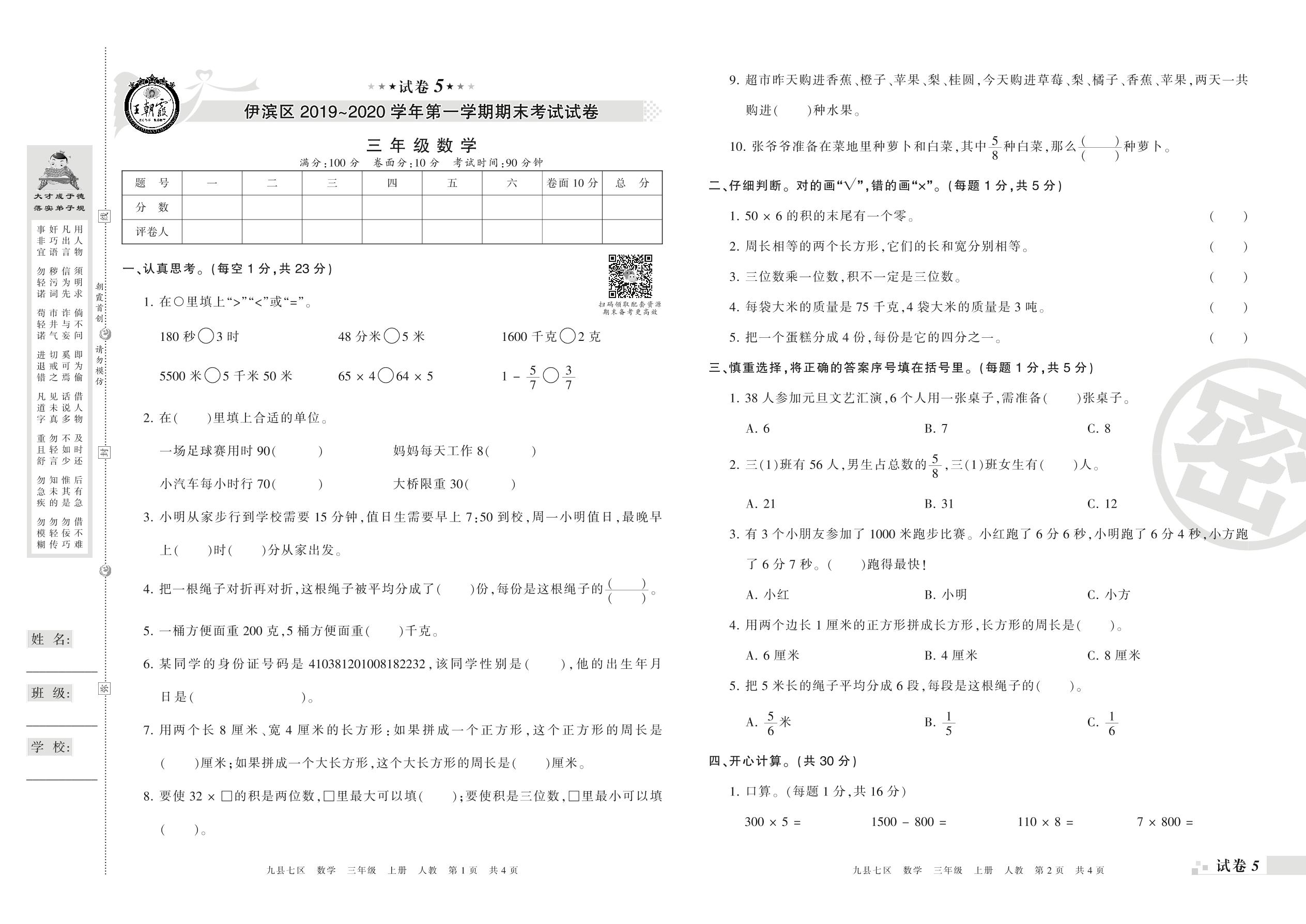 2019-2020学年第一学期洛阳市伊滨区三年级数学试卷(人教版)【5】