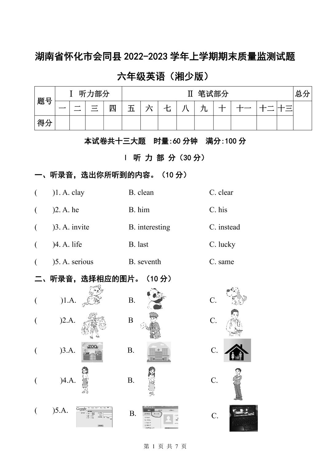 湖南省怀化市会同县2022-2023学年上学期期末质量监测试题六年级英语(湘少版)【无听力音频】