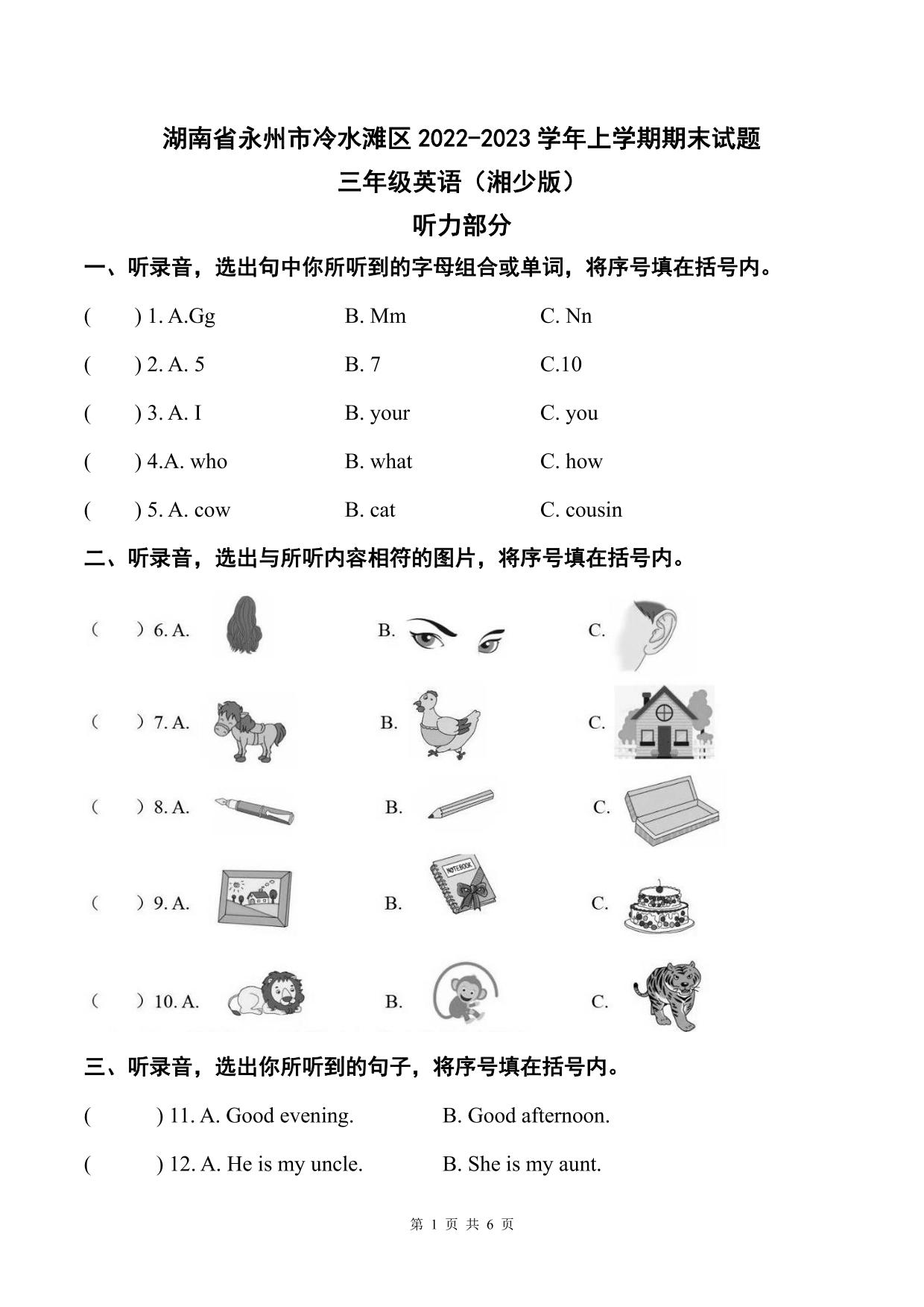 湖南省永州市冷水滩区2022-2023学年上学期期末试题三年级英语(湘少版)【无听力音频】