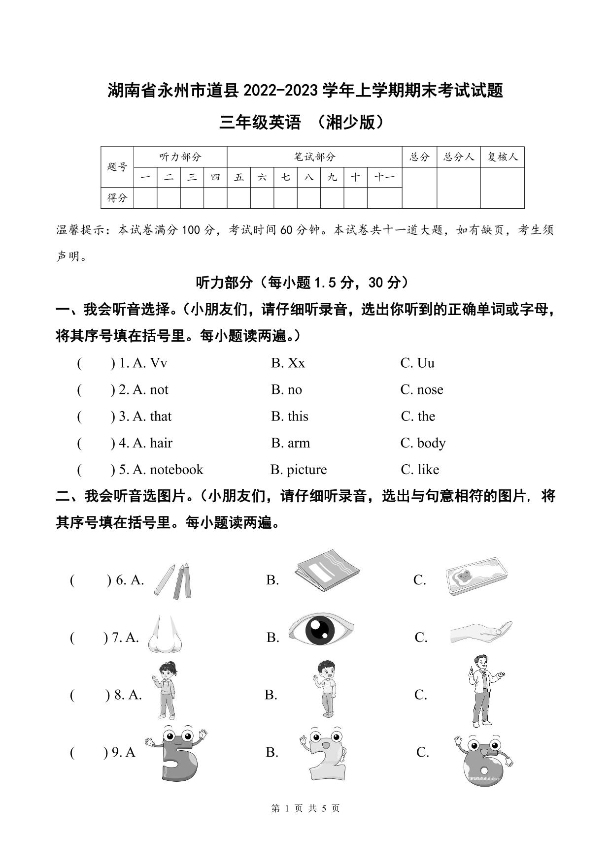 湖南省永州市道县2022-2023学年上学期期末考试试题三年级英语 (湘少版)【无听力音频】