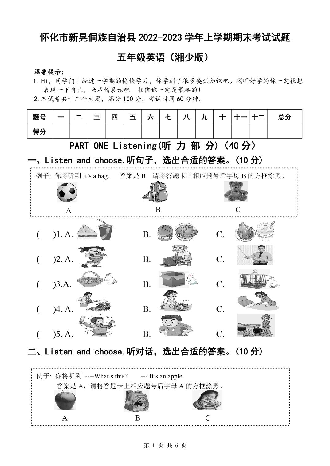 湖南省怀化市新晃侗族自治县2022—2023学年上学期期末考试试题五年级英语(湘少版)【无听力音频】