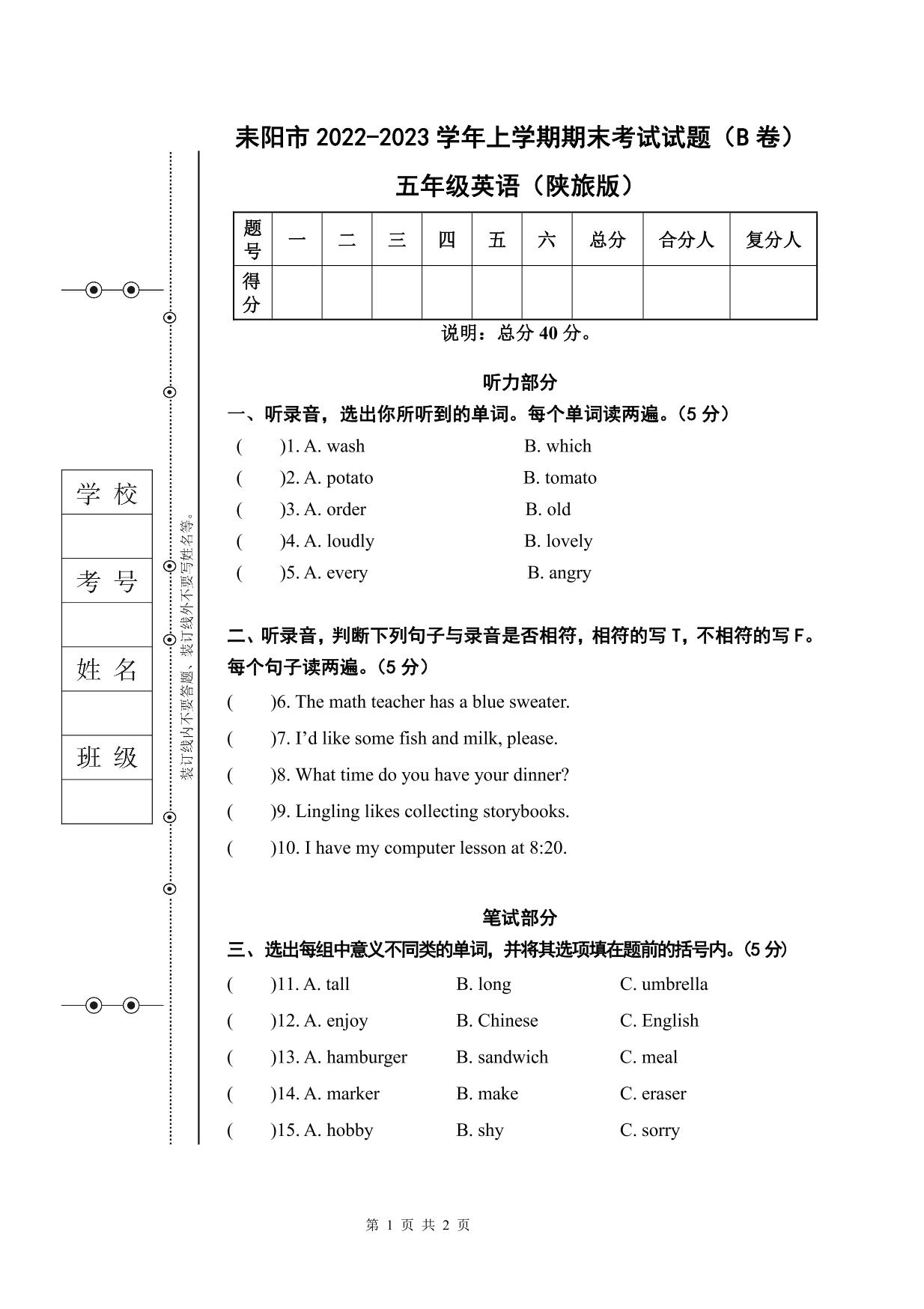 湖南省衡阳市耒阳市2022-2023学年上学期期末考试试题(B卷)五年级英语(陕旅版)【无听力音频】