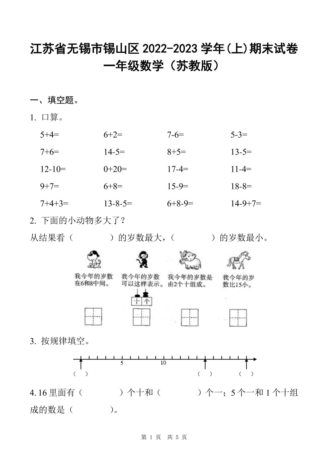 江苏省无锡市锡山区2022-2023学年(上)期末试卷一年级数学(苏教版)
