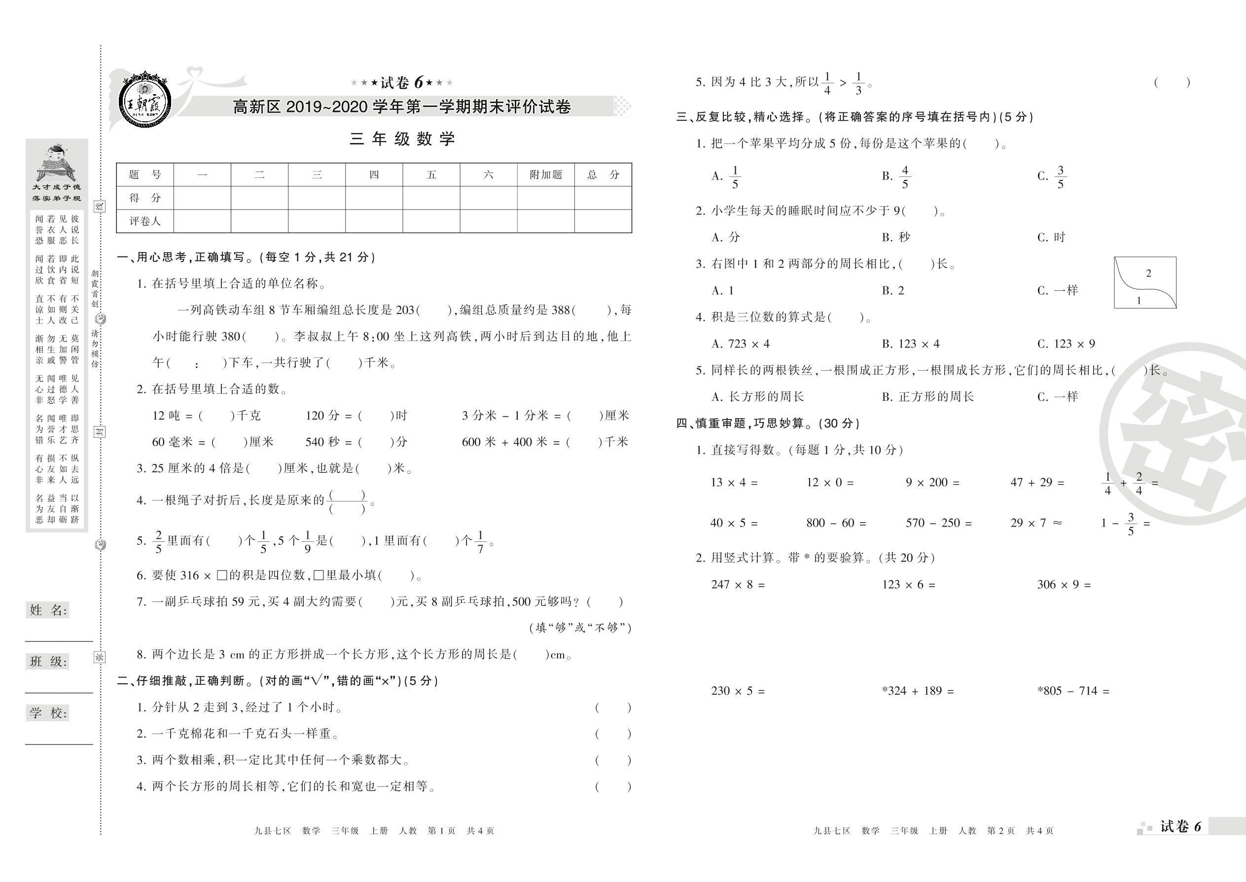 2019-2020学年第一学期洛阳市高新区三年级数学试卷(人教版)【6】