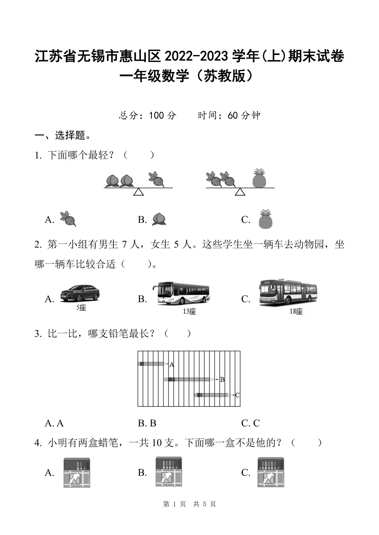江苏省无锡市惠山区2022-2023学年(上)期末试卷一年级数学(苏教版)