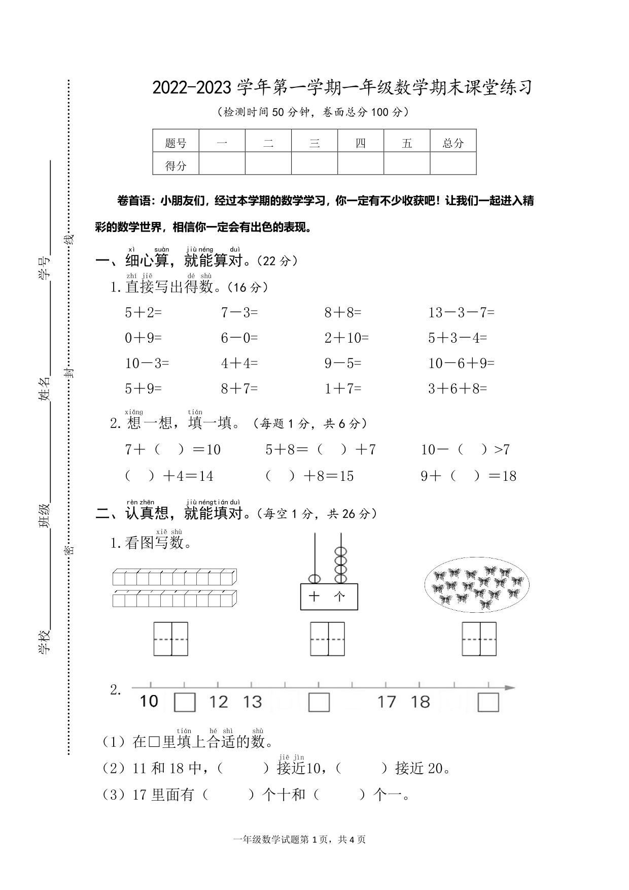 江苏省盐城市盐都区2022-2023学年第一学期期末课堂练习一年级数学(苏教版)