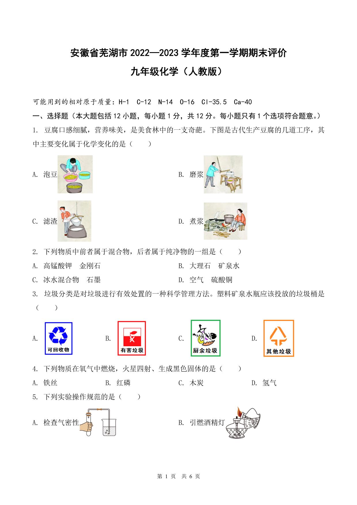 安徽省芜湖市2022-2023学年度第一学期期末评价九年级化学(人教版)