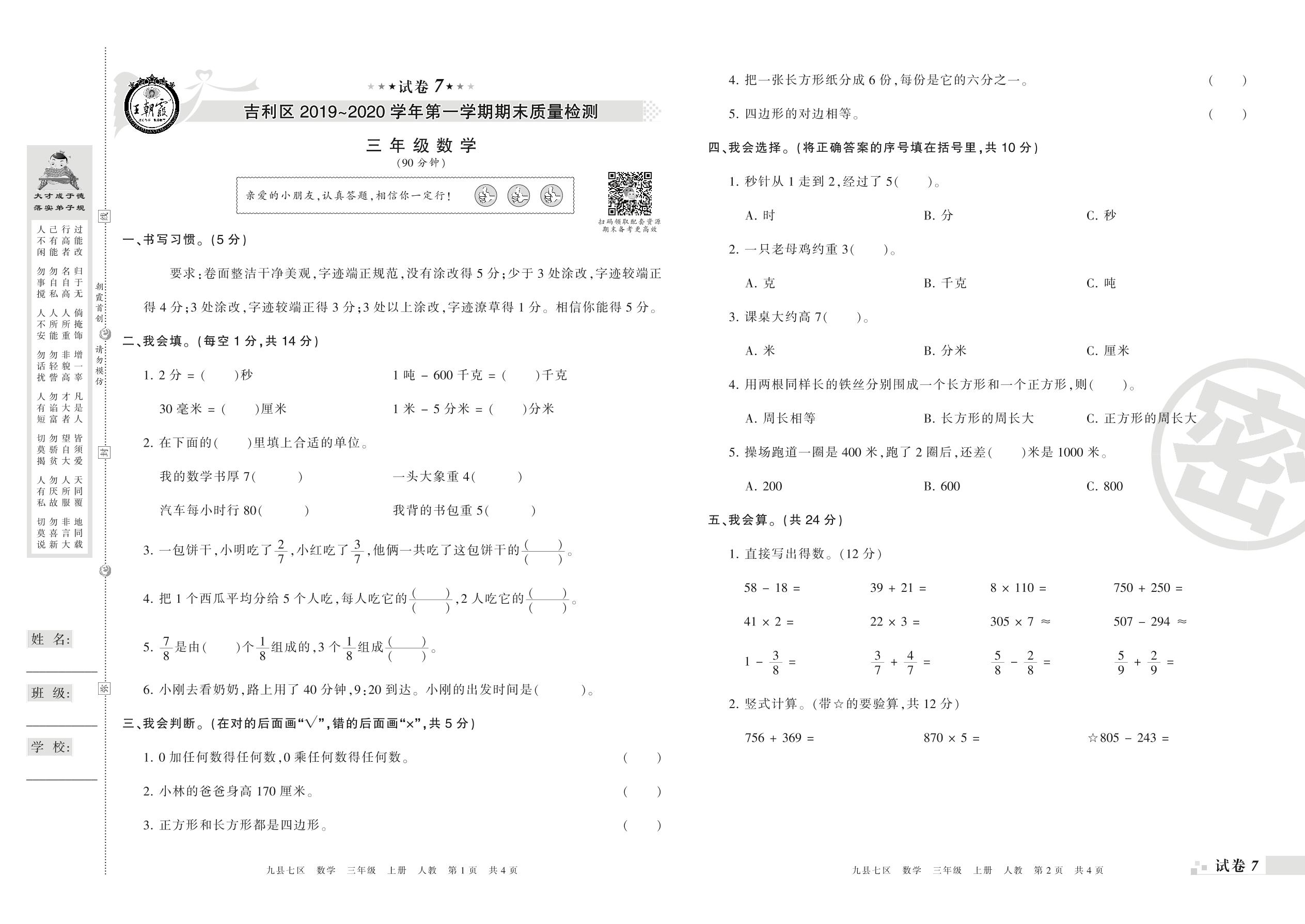 2019-2020学年第一学期洛阳市吉利区三年级数学试卷(人教版)【7】