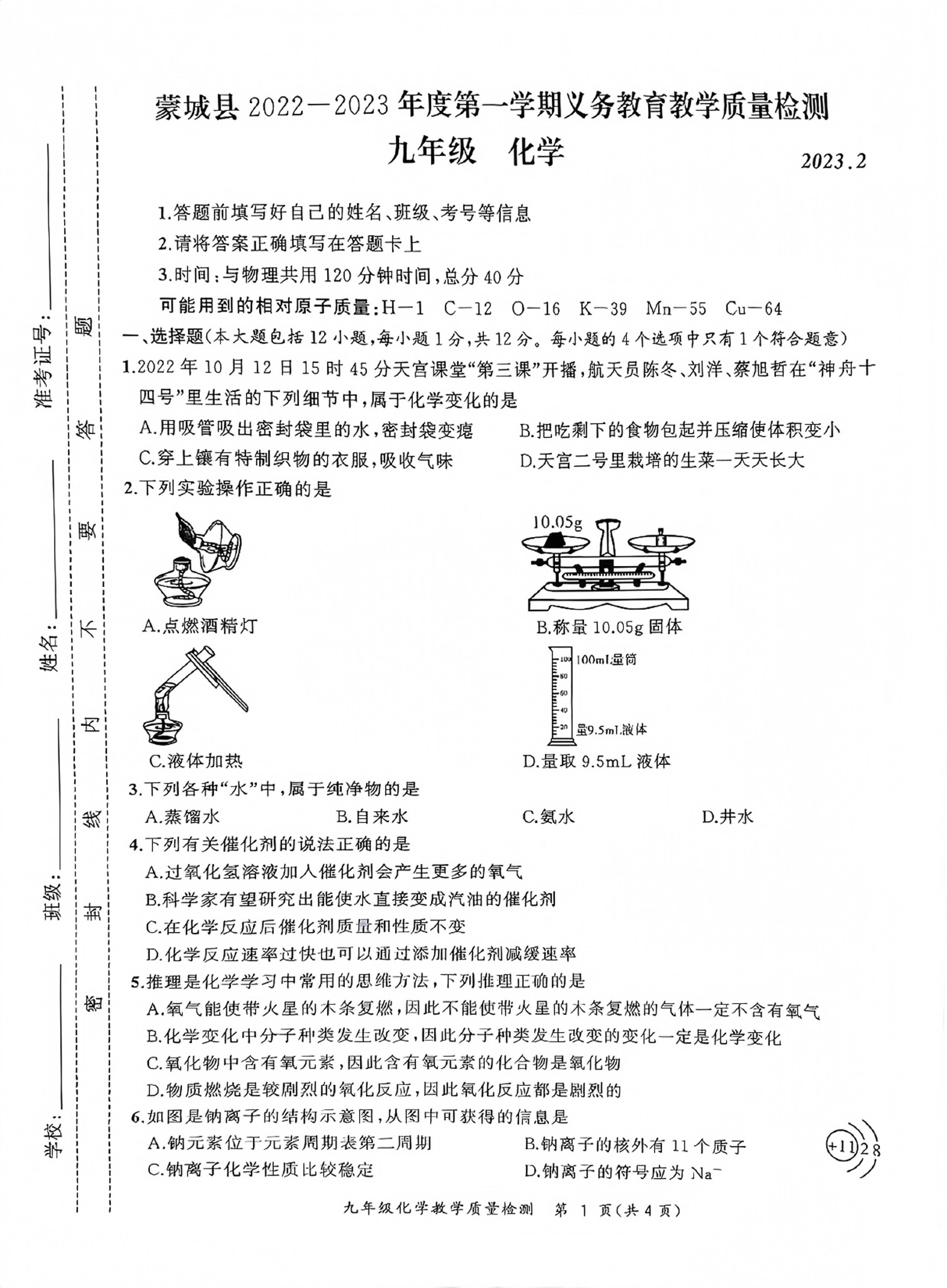 安徽省亳州市蒙城县2022-2023学年度第一学期义务教育教学质量检测九年级化学(人教版)