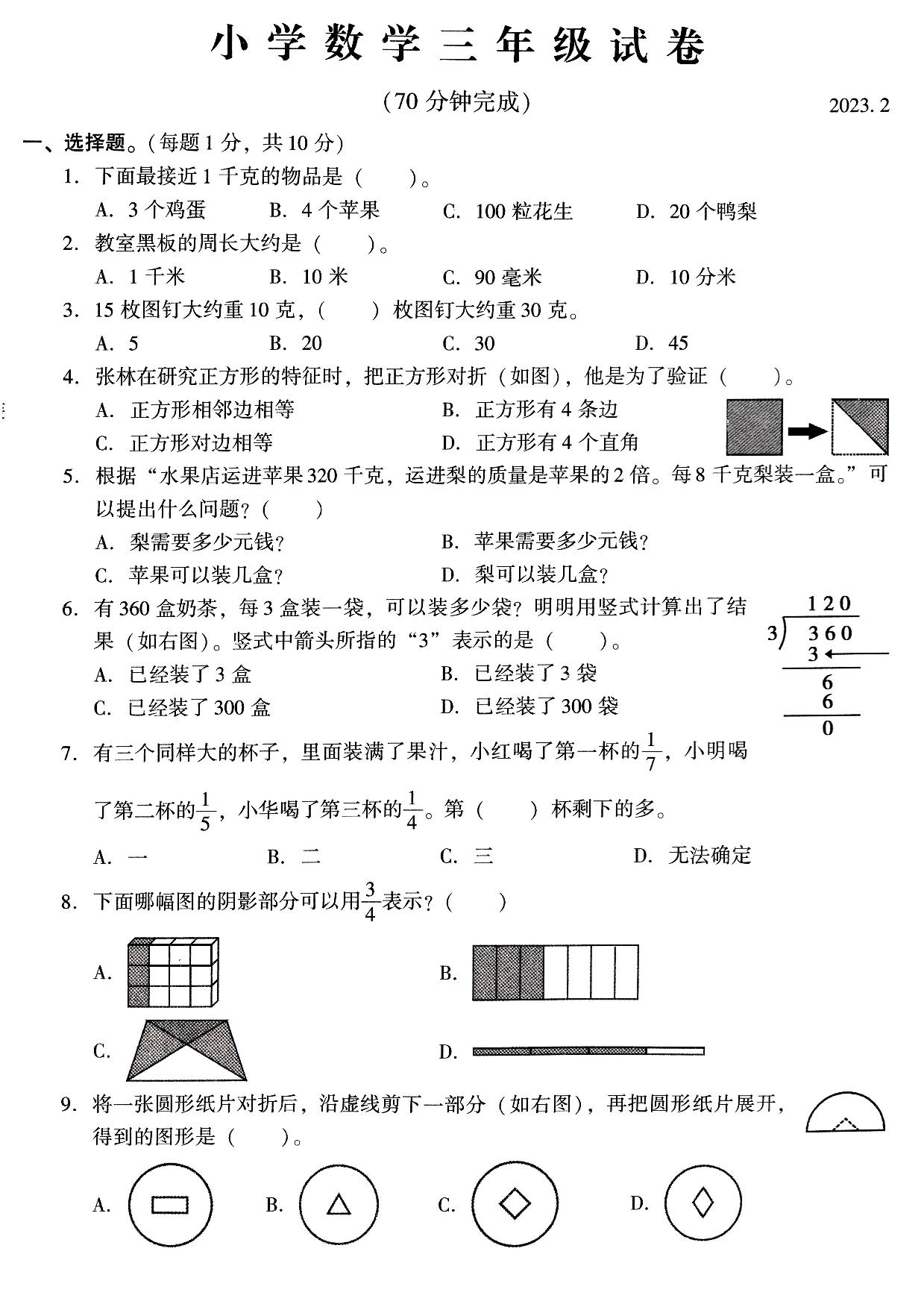 江苏省苏州市常熟市2022-2023学年(上)期末试卷三年级数学(苏教版)
