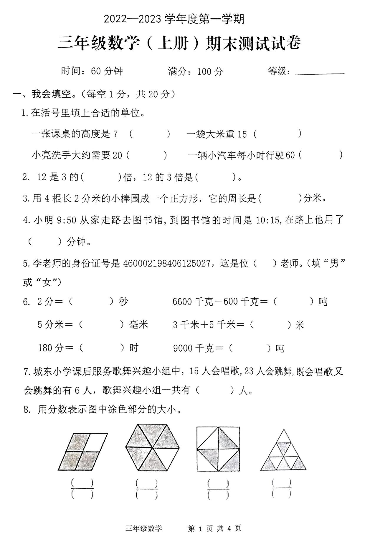 江苏省常州市武进区2022-2023学年度第一学期期末测试试卷三年级数学(苏教版)