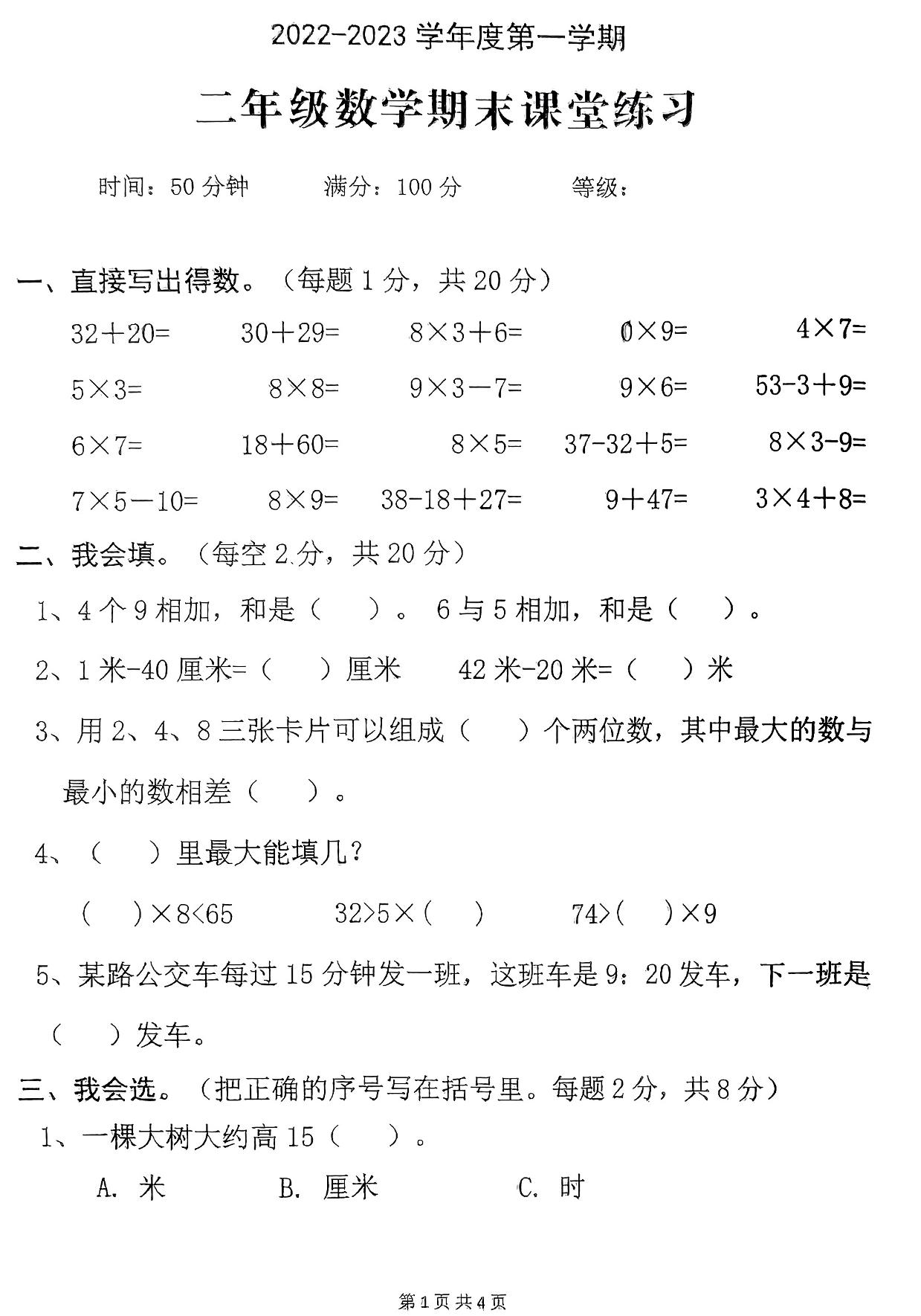 二年级数学苏教版上册期末卷