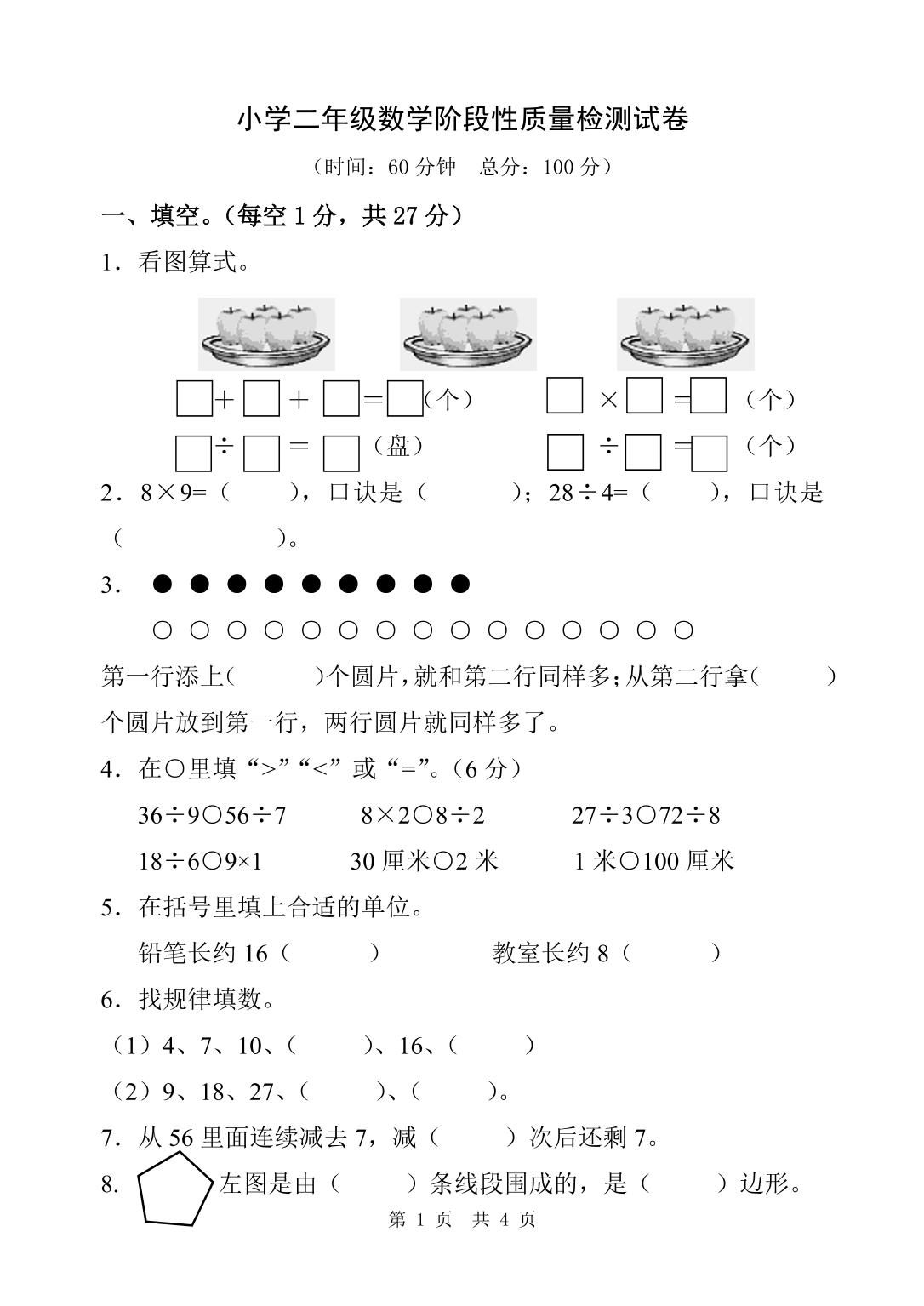 江苏省淮安市淮安区2022-2023学年上学期期末阶段性质量检测试卷二年级数学(苏教版)