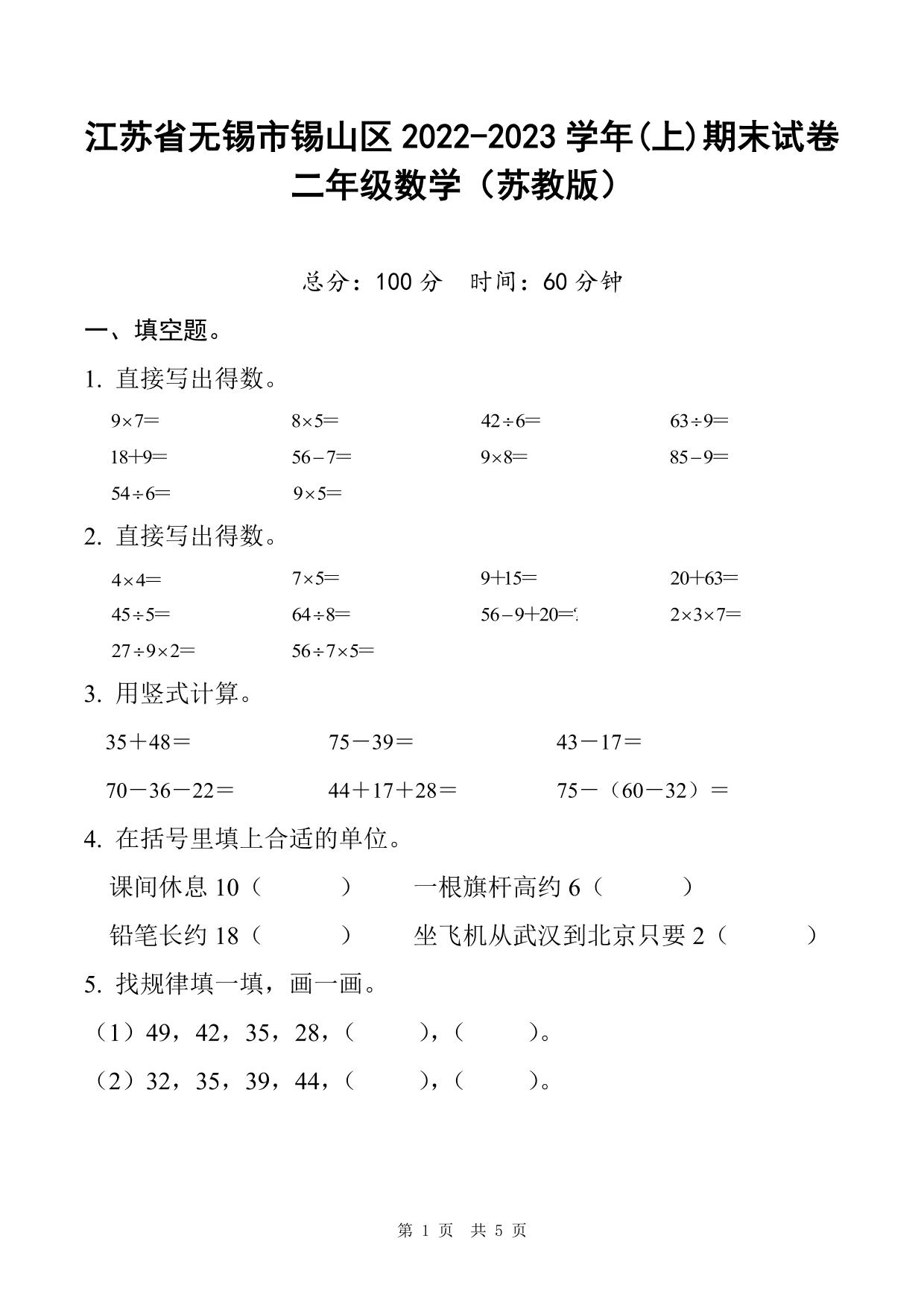 江苏省无锡市锡山区2022-2023学年(上)期末试卷二年级数学(苏教版)