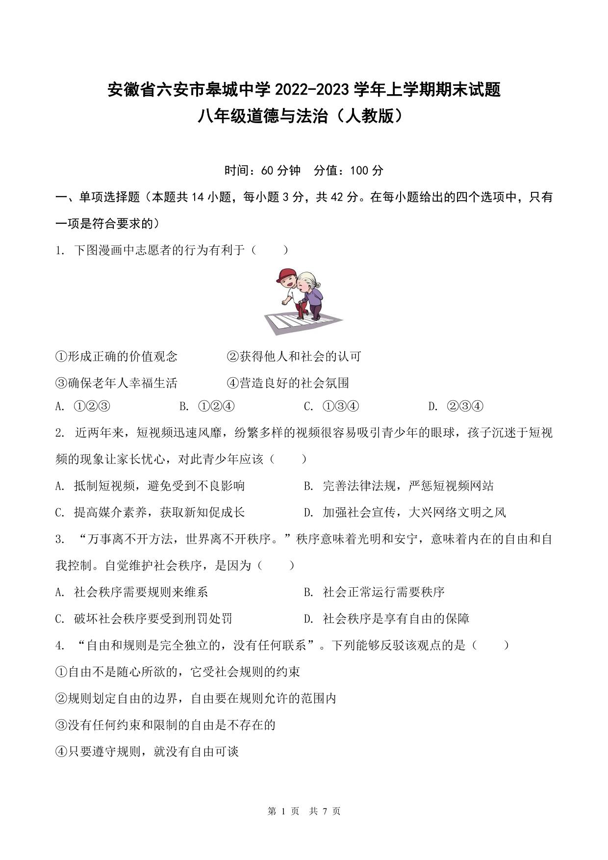 安徽省六安市皋城中学2022-2023学年上学期期末试题八年级道德与法治(人教版)