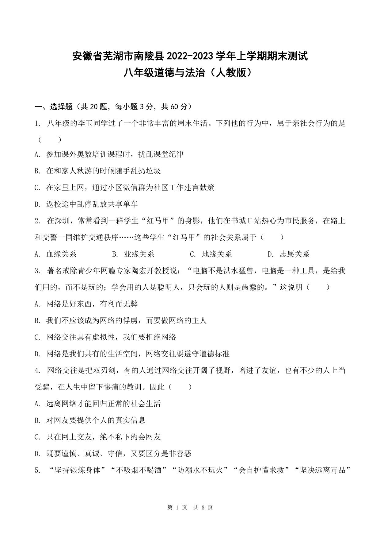 安徽省芜湖市南陵县2022-2023学年上学期期末测试八年级道德与法治(人教版)