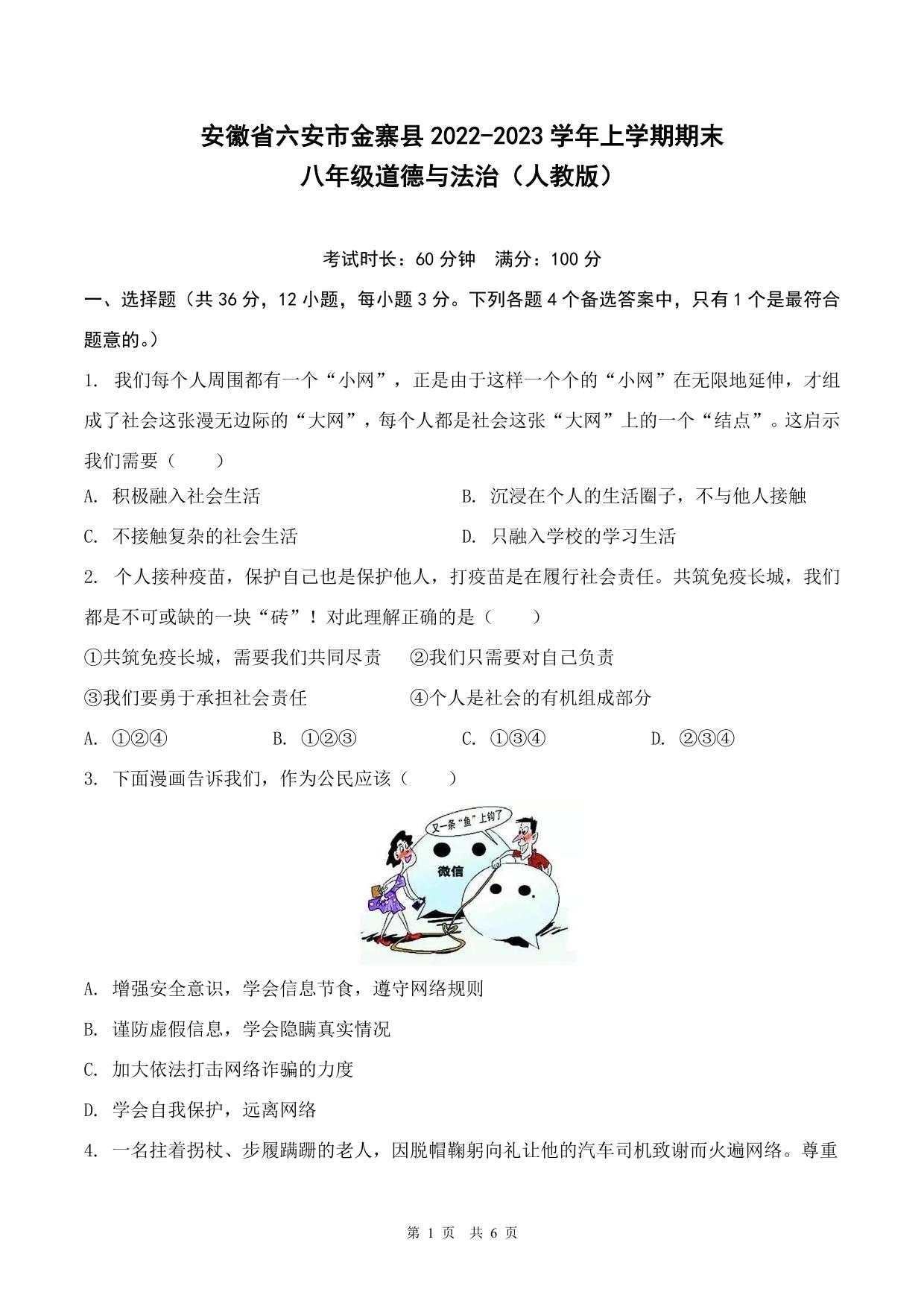 安徽省六安市金寨县2022-2023学年上学期期末八年级道德与法治(人教版)