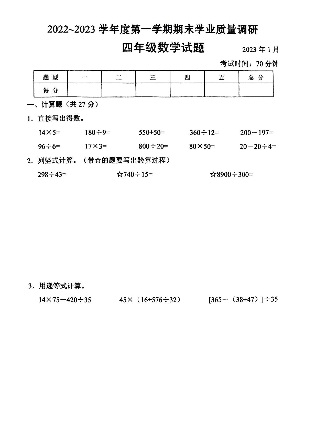 江苏省常州市溧阳市2022-2023学年度第一学期期末学业质量调研试题四年级数学(苏教版)