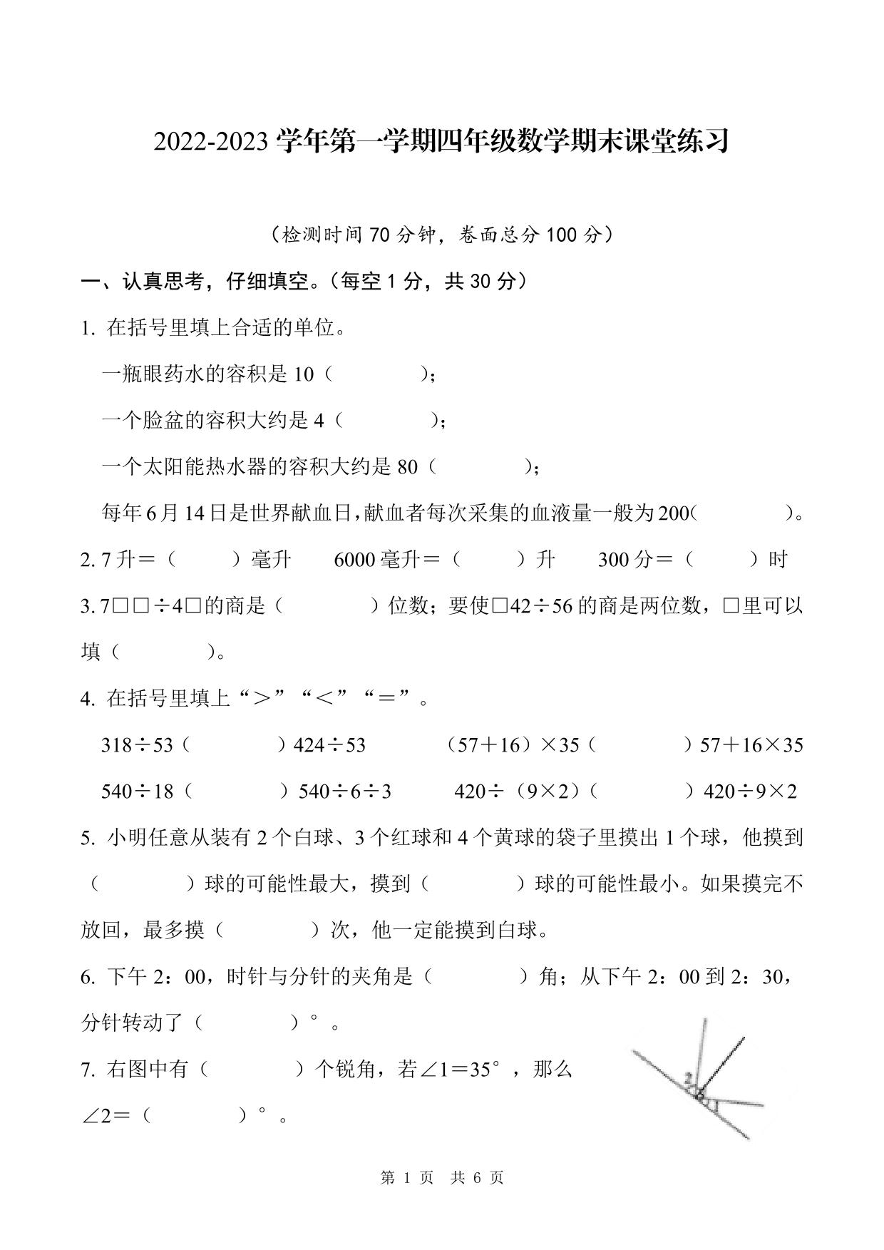 江苏省盐城市盐都区2022-2023学年第一学期期末课堂练习四年级数学(苏教版)