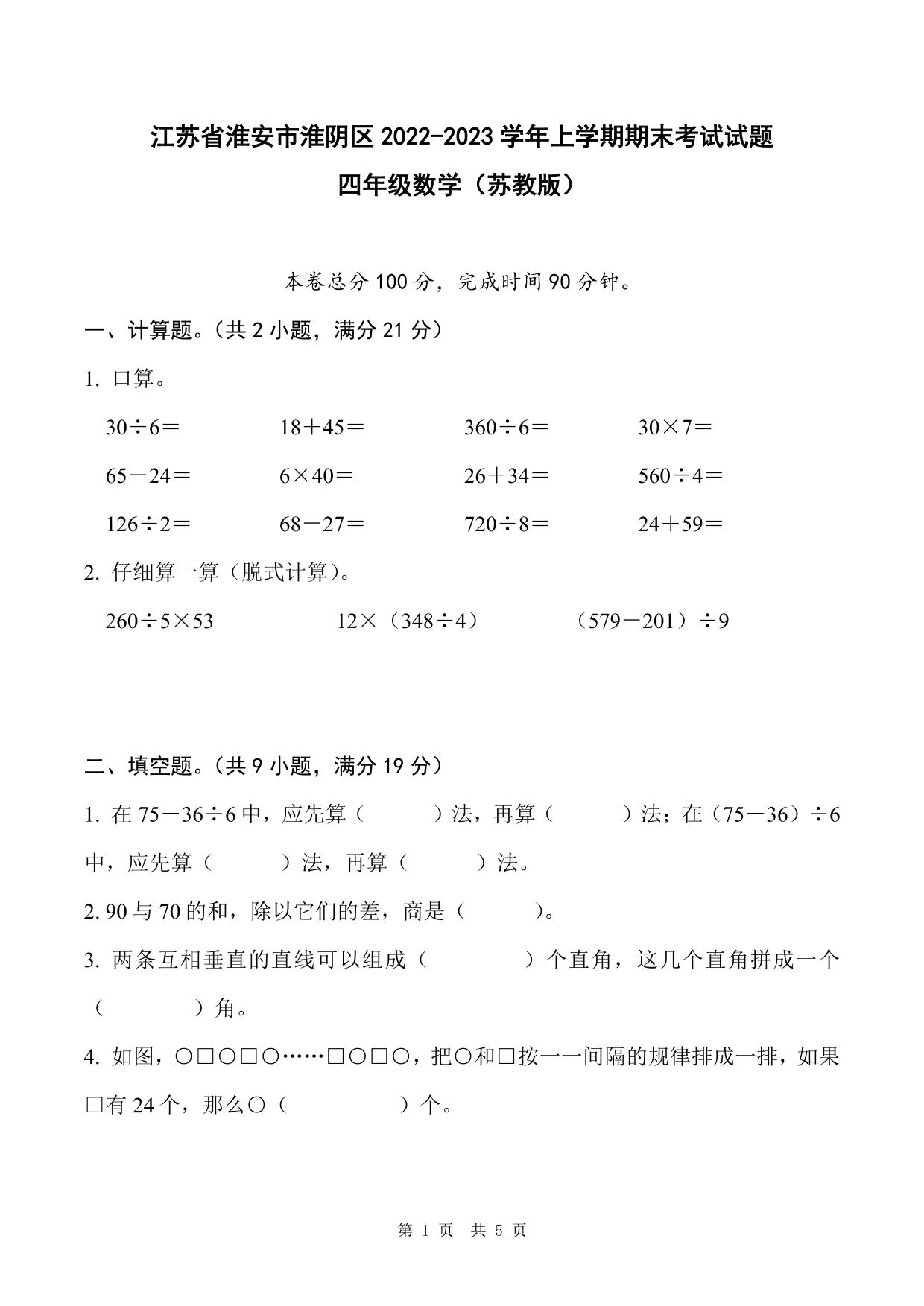 江苏省淮安市淮阴区2022-2023学年上学期期末考试试题四年级数学(苏教版)