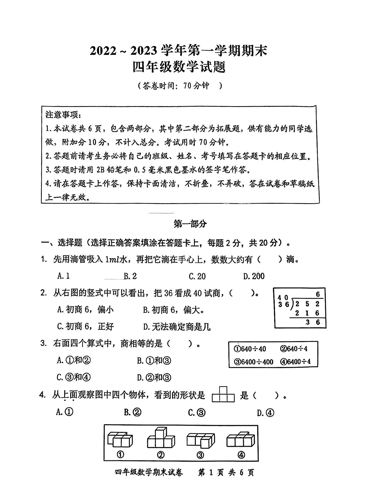 江苏省南通市启东市2022-2023学年第一学期期末试题四年级数学(苏教版)