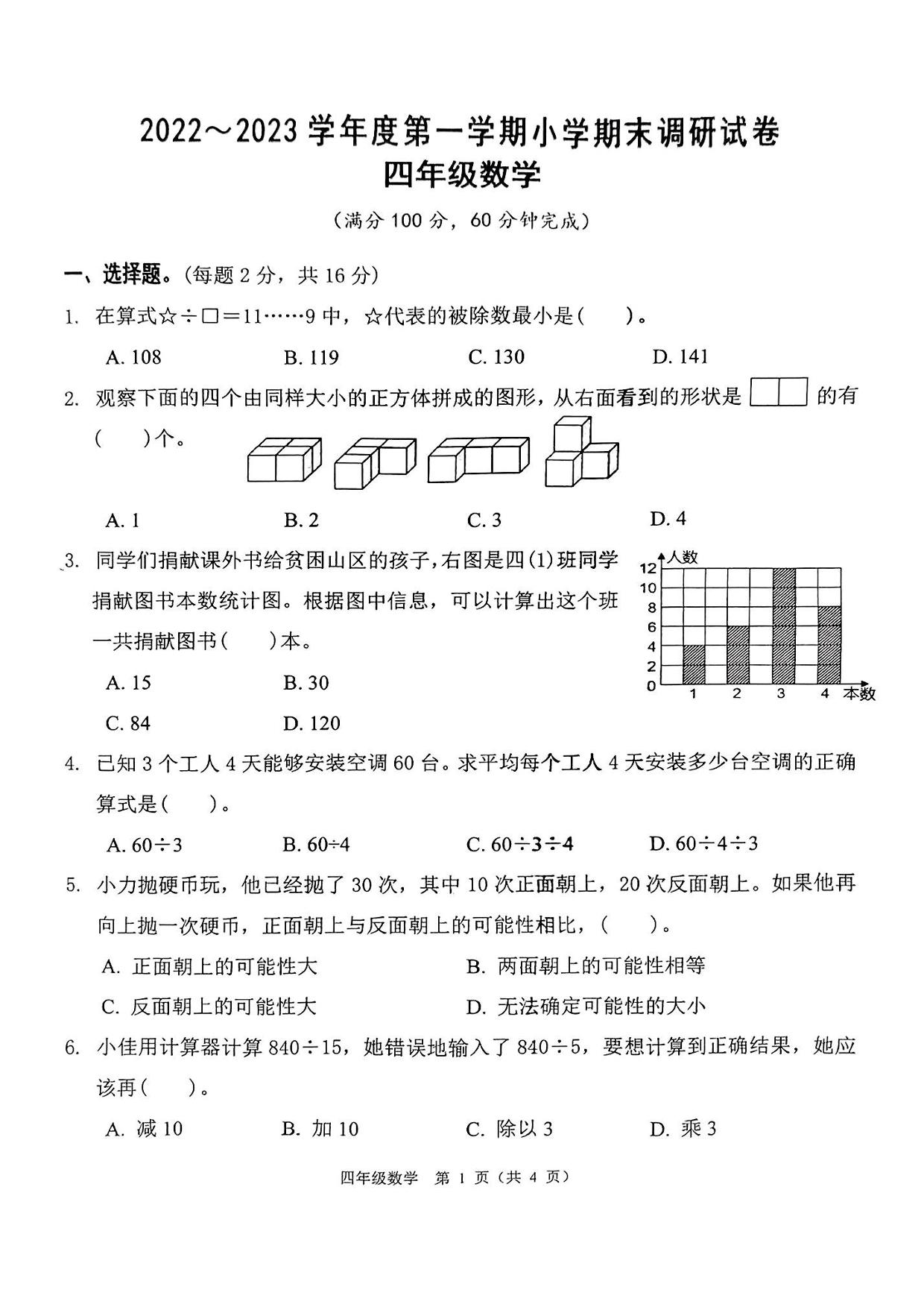 江苏省南通市如东县2022-2023学年度第一学期期末调研试卷四年级数学(苏教版)