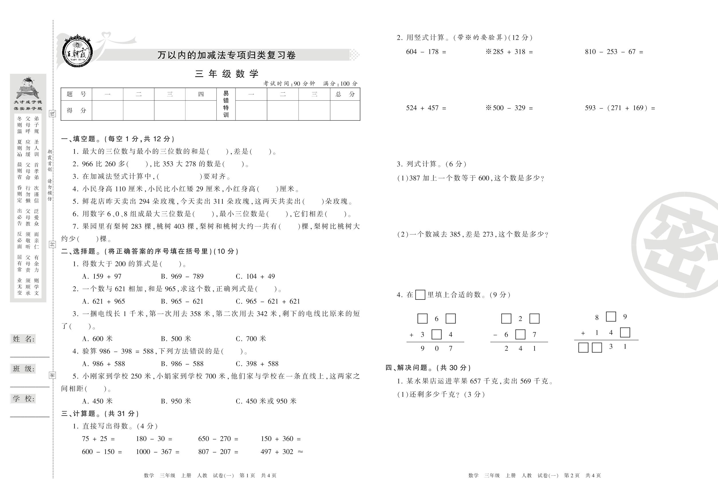王朝霞期末专项卷——万以内的加减法专项归类复习三年级上册数学(人教版)【0】